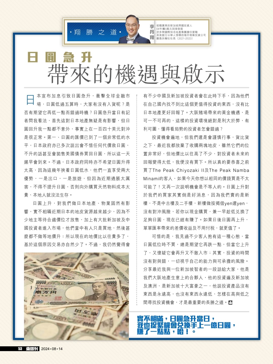 日圓上升,對我們做日本地產、物業固然有影響,實不相瞞近期日本的地皮貨源越來越少,因為不少地主等待合適價位才放售,加上有大批新加坡及中國投資者進入市場,他們當中有人只是買地,然後甚麼都不做等地價升;所以現在的地價比以往貴多了,基於這個原因交易亦自然少了。不過,我仍然覺得會有不少中國及新加坡投資者會在此時下手,因為他們在自己國內找不到比這個更值得投資的東西,沒有比日本地產更好回報了。大阪賭場帶來的黃金機遇,是可一不可再的,這樣的投資環境絕對是利大於弊,有利可圖,懂得看局勢的投資者怎會錯過?