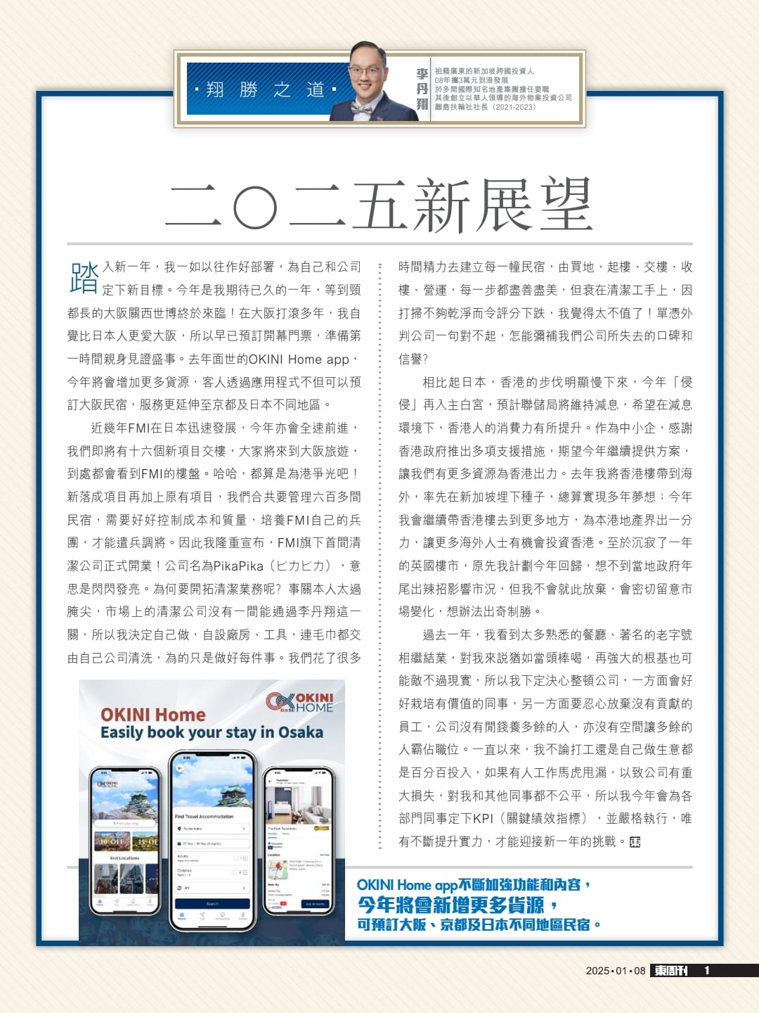 踏入新一年,我一如以往作好部署,為自己和公司定下新目標。今年是我期待已久的一年,等到頸都長的大阪關西世博終於來臨!在大阪打滾多年,我自覺比日本人更愛大阪,所以早已預訂開幕門票,準備第一時間親身見證盛事。去年面世的OKINI Home app,今年將會增加更多貨源,客人透過應用程式不但可以預訂大阪民宿,服務更延伸至京都及日本不同地區。