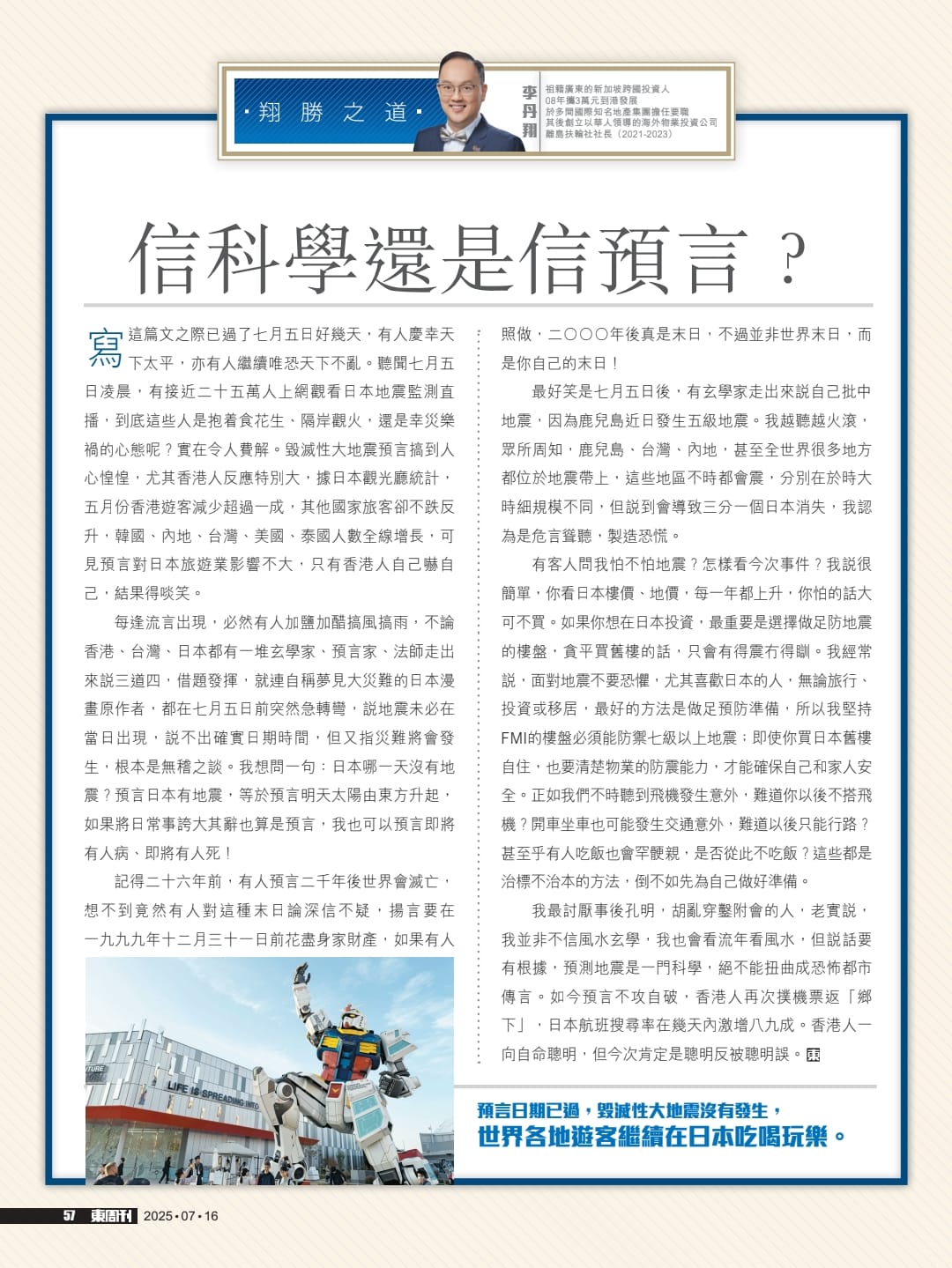 我最討厭事後孔明,胡亂穿鑿附會的人,老實說,我並非不信風水玄學,我也會看流年看風水,但說話要有根據,預測地震是一門科學,絕不能扭曲成恐怖都市傳言。如今預言不攻自破,香港人再次撲機票返「鄉下」,日本航班搜尋率在幾天內激增八九成。香港人一向自命聰明,但今次肯定是聰明反被聰明誤。