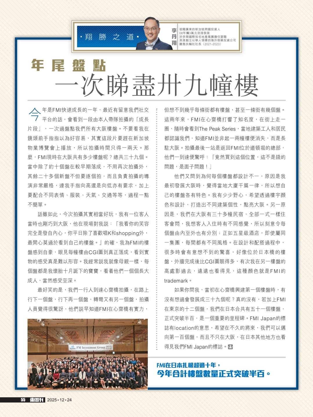 如果你問我,當初在心齋橋興建第一個樓盤時,有沒有想過會發展成三十九個呢?真的沒有,若加上FMI在東京的十二個盤,我們在日本合共有五十一個樓盤,正式突破半百,是一個重要的里程碑。FMI Japan的標誌有location的意思,希望在不久的將來,我們可以邁向第一百個盤,而且不只在大阪,在日本其他地方也看得見我們FMI Japan的標誌。