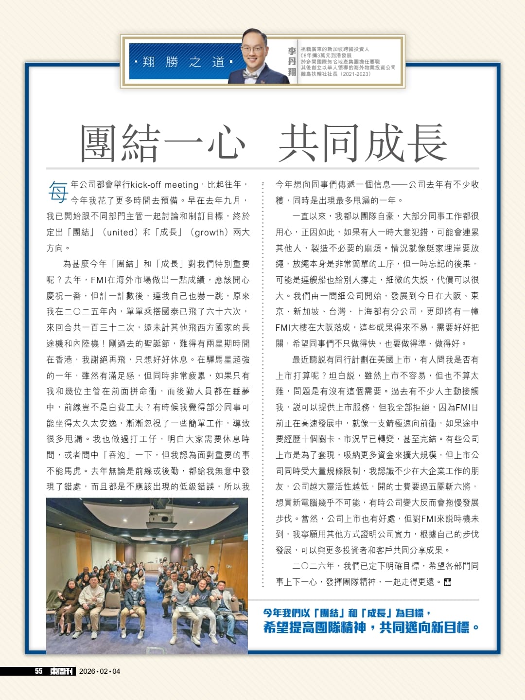 每年公司都會舉行kick-off meeting,比起往年,今年我花了更多時間去預備。早在去年九月,我已開始跟不同部門主管一起討論和制訂目標,終於定出「團結」(united)和「成長」(growth)兩大方向。