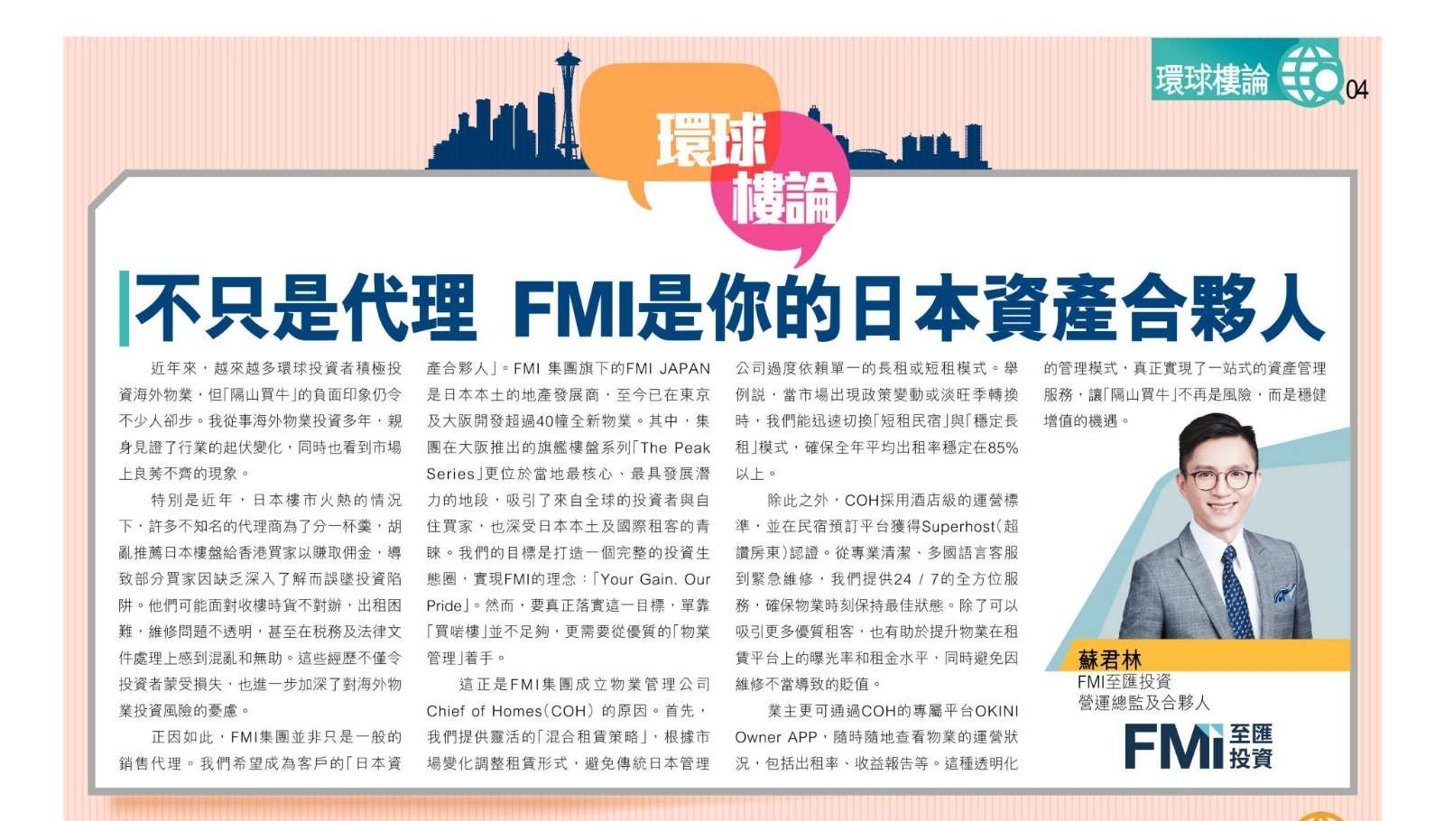 撰寫這篇文章的時候,我剛剛完成了FMI 2026年度的Kick-Off Meeting。每年年初,我總會為集團和自己個人設定新一年的發展目標,而今年的規劃,無論是規模還是願景,都令我十分期待。2026年,我們將以全面進軍日本房地產市場為目標,加速在大阪的發展。
