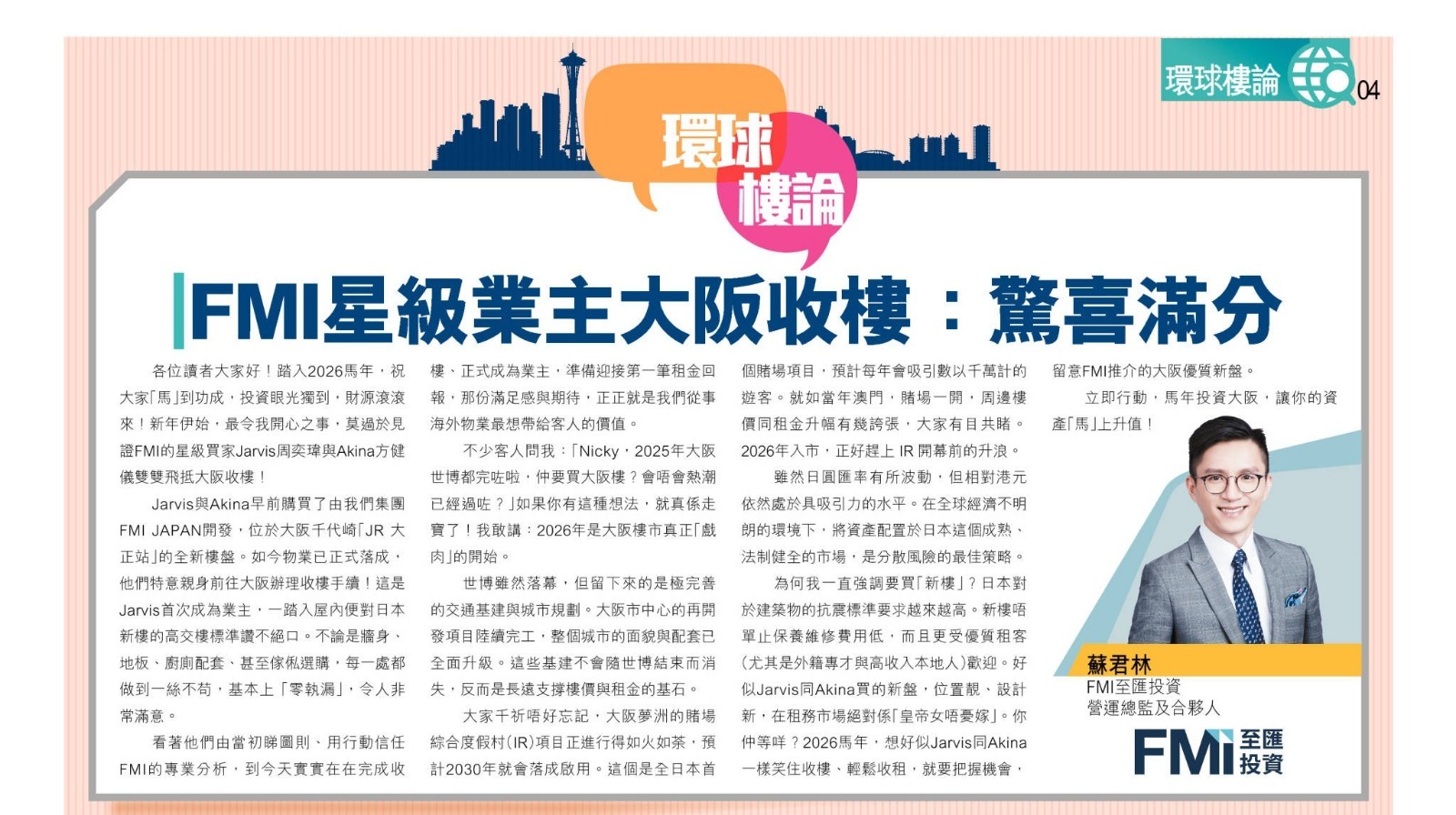 各位讀者大家好!踏入 2026 馬年,祝大家「馬」到功成,投資眼光獨到,財源滾滾來!新年伊始,最令我開心之事,莫過於見證 FMI 的星級買家 Jarvis 周奕瑋與 Akina 方健儀雙雙飛抵大阪收樓!