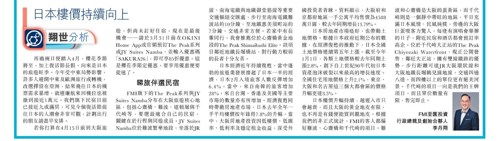 日本樓價升幅持續,愈遲入市只會愈貴,而且大阪的黃金地皮有限,也不再是有錢便能買到靚地皮。根據我們的非正式統計,FMI 的客人都偏好難波、心齋橋和千代崎的項目。難波和心齋橋是大阪的蛋黃區,而千代崎則是一個靜中帶旺的地區,平日充滿日本風情、民風純樸,旁邊的大阪巨蛋吸客力驚人,每逢有演唱會舉辦的日子,附近民宿和酒店都會預訂率高企。位於千代崎大正站的The Peak Chiyozaki Waterfront,現正公開發售,鄰近大正站,擁有雙線鐵路的優勢,步行距離可達JR大阪環狀線和大阪地鐵長堀鶴見綠地線,交通四通八達。而四樓以上的單位更有絕美河景。千代崎的項目一向是我們的皇牌項目,而且單位數量有限,售完即止。