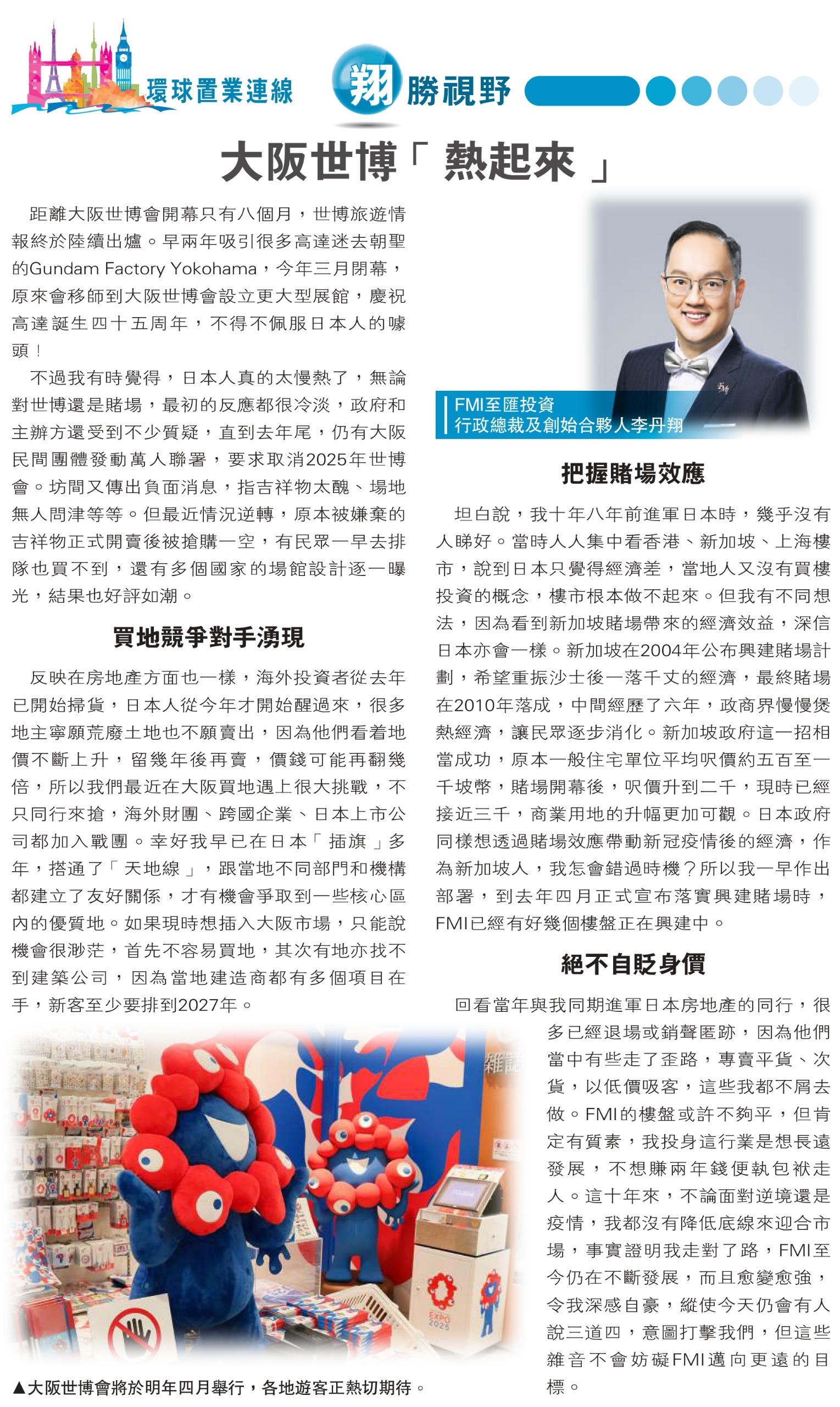 坦白說,我十年八年前進軍日本時,幾乎沒有人睇好,當時人人集中看香港、新加坡、上海樓市,說到日本只覺得經濟差,當地人又沒有買樓投資的概念,樓市根本做不起來。但我有不同想法,因為看到新加坡賭場帶來的經濟效益,深信日本亦會一樣。新加坡在2004年公布興建賭場計劃,希望重振沙士後一落千丈的經濟,最終賭場在2010年落成,中間經歷了六年,政商界慢慢煲熱經濟,讓民眾逐步消化。新加坡政府這一招相當成功,原本一般住宅單位平均呎價約五百至一千坡幣,賭場開幕後,呎價升到二千,現時已經接近三千,商業用地的升幅更加可觀。日本政府同樣想透過賭場效應帶動新冠疫情後的經濟,作為新加坡人,我怎會錯過時機﹖所以我一早作出部署,到去年四月正式宣布落實興建賭場,FMI已經有好幾個樓盤正在興建中。