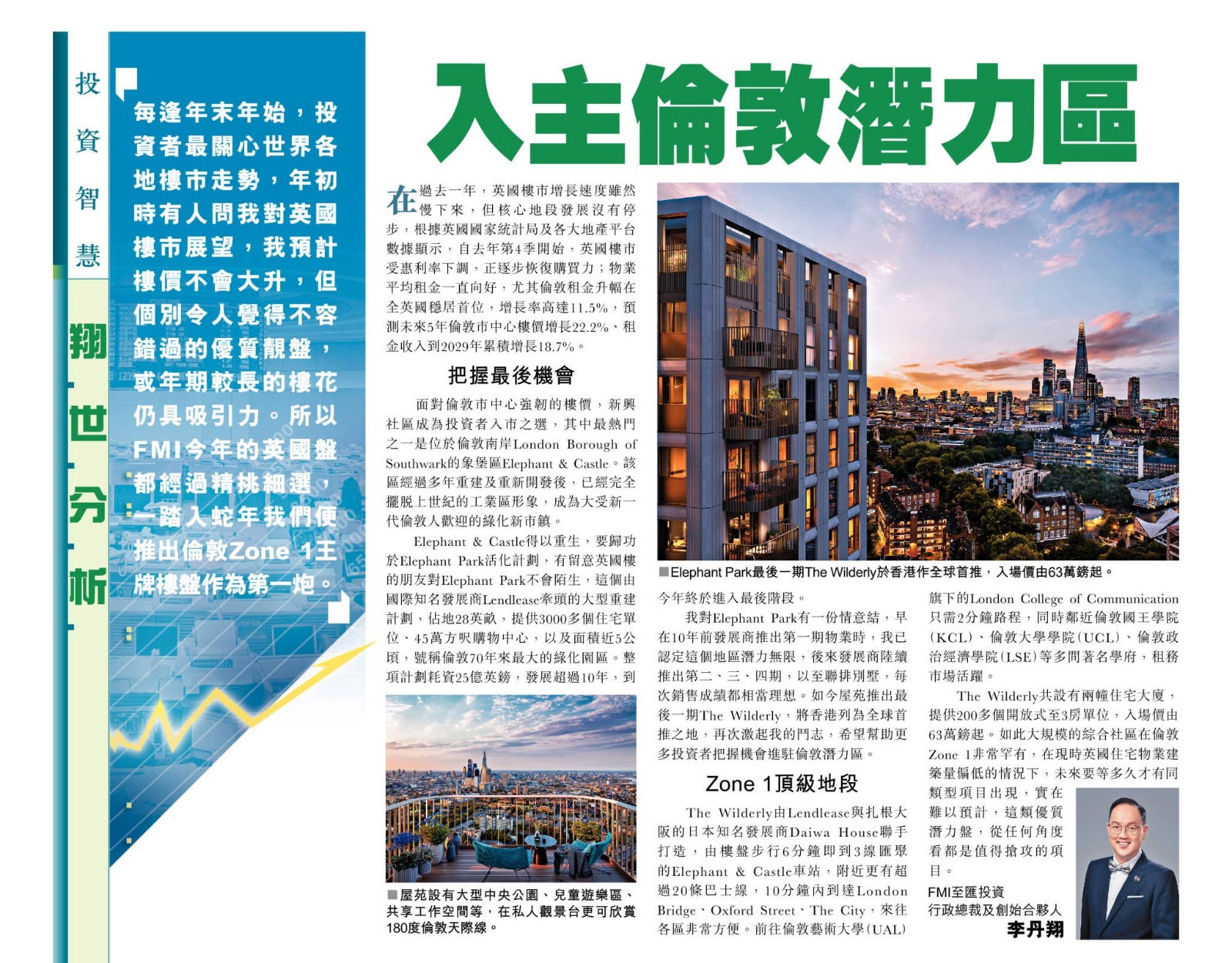 我對Elephant Park有一份情意結,早在十年前發展商推出第一期物業時,我已認定這個地區潛力無限,後來發展商陸續推出第二、三、四期,以至聯排別墅,每次銷售成績都相當理想。如今屋苑推出最後一期The Wilderly,將香港列為全球首推之地,再次激起我的鬥志,希望幫助更多投資者把握機會進駐倫敦潛力區。