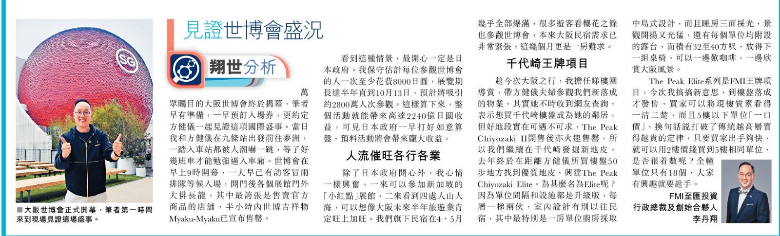 除了日本政府開心外,我心情一樣興奮,一來可以參加新加坡的「小紅點」展館,二來看到四處人山人海,可以想像大阪未來半年的旅遊業肯定旺上加旺。事實上,我們旗下民宿在四、五月幾乎全部爆滿,很多遊客像方健儀一樣,看櫻花之餘也參觀世博會,本來大阪民宿的需求已非常緊張,這幾個月更加是一房難求。