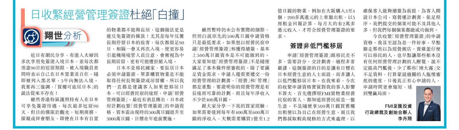 日本不是移民國家,要長居日本必須申請簽證,單靠購買物業是不能取得任何長期簽證或居留權,所以我們一直都是建議客人如果想移居日本,可以經營民宿的途經,申請「經營管理簽證」。最近有消息傳出,日本政府計劃收緊「經營管理簽證」的申請資格,資本需由現時的五百萬日圓(約二十六點五萬港元)提升五倍至三千萬日圓(約一百五十九點五萬港元),目標在年底前實施。