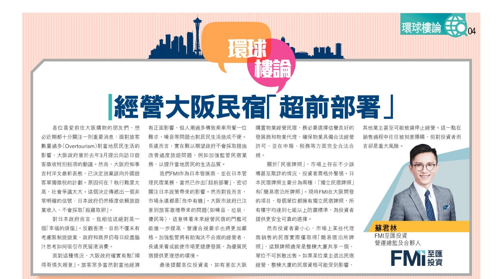 我們FMI作為日本發展商,並在日本管理民宿業務,當然已作出「超前部署」,密切關注日本政策帶來的影響。然而對我而言,市場永遠都是「危中有機」。大阪市政府已注意到旅客激增帶來的問題(如噪音、垃圾、擾民等),這意味著未來經營民宿的門檻可能進一步提高,營運合規要求也將更加嚴格。加強監管將有助淘汰不合規的經營者,長遠來看或能使市場更健康發展,為優質民宿提供更理想的環境。