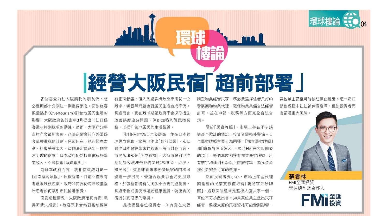日本房地產成為全球投資者的焦點,鑑於日圓持續疲弱,加上租金不斷上升,外資正大手掃貨,商用物業的收購額是去年同期的兩倍,超過一萬億日元,創下歷史新高。外國投資者當中,不乏國際知名的企業及大財團,兩星期前,凱悅酒店集團宣布將會在大阪難波站旁邊,打造一幢樓高二十八層,提供二百六十多間客房的酒店,預計2031年開業。大阪樓市興旺,對我們發展商來說必然是好消息,不過一般投資者背後沒有一隊專家協助分析市場走勢,投資者要買得精明,首先是要找對的人。