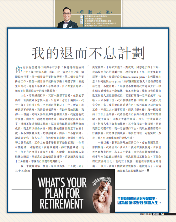 我三十歲賺到第一桶金,原本以為要三十五歲,到了三十五歲就決定創業,十年來算做了一點成績,回想過去四十五年,我都按照自己的計劃行事,現在還剩下五年,我更要好好部署。首先,要做好公司的succession plan,如何擴充生意?如何做到auto pilot?如何讓團隊更強大?這些都是當務之急,不做計劃,五年後便不能實踐我的退休大計。很多朋友聽到我五十歲退休,都不太相信,覺得以我這樣喜歡工作的人怎能說退就退,甚至打賭我一定不能成事!哈哈,大家不用下注,我心裏很清楚自己的計劃,我並不是完全退下來,我的想法是希望自己不需再處理公司的日常工作,不需為大小瑣事煩惱。而我「退休後」第一樣要做的「工作」是培訓,我希望把自己在海外地產及管理的經驗,授予國內、日本及香港的團隊,以另一方式貢獻公司。何況人生不會盡如你意,五十歲只是一個指標,只要我對公司還有用,我一定會堅持下去。我現在最需要是守好兩個關,就是機會與風險,那麼公司就一定能突破;然後,我才可以過我理想的退休生活。