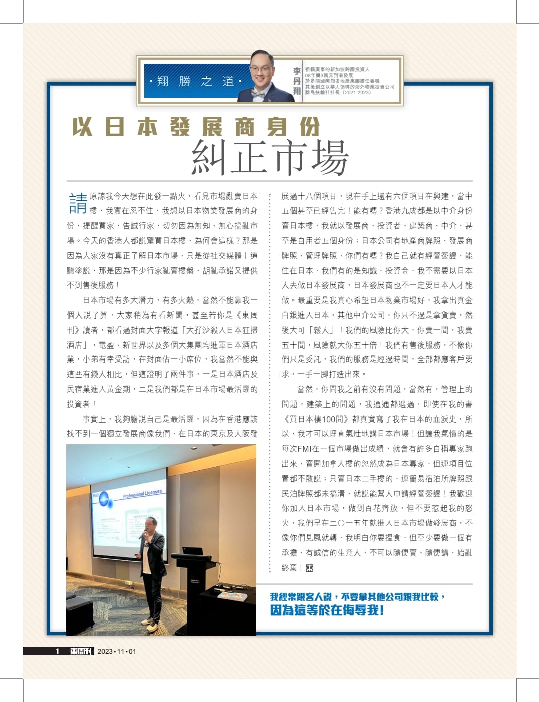 事實上,我夠膽說自己是最活躍,因為在香港應該找不到一個獨立發展商像我們,在日本的東京及大阪發展過十八個項目,現在手上還有六個項目在興建,當中五個甚至已經售完!能有嗎?香港九成都是以中介身份賣日本樓,我就以發展商、投資者、建築商、中介,甚至是自用者五個身份;日本公司有地產商牌照、發展商牌照、管理牌照,你們有嗎?我自己就有經營簽證,能住在日本,我們有的是知識、投資金,我不需要以日本人去做日本發展商,日本發展商也不一定要日本人才能做。最重要是我真心希望日本物業市場好,我拿出真金白銀進入日本,其他中介公司,你只不過是拿貨賣,然後大可「鬆人」!我們的風險比你大,你賣一間,我賣五十間,風險就大你五十倍!我們有售後服務,不像你們只是委托,我們的服務是經過時間,全部都應客戶要求,一手一腳打造出來。
