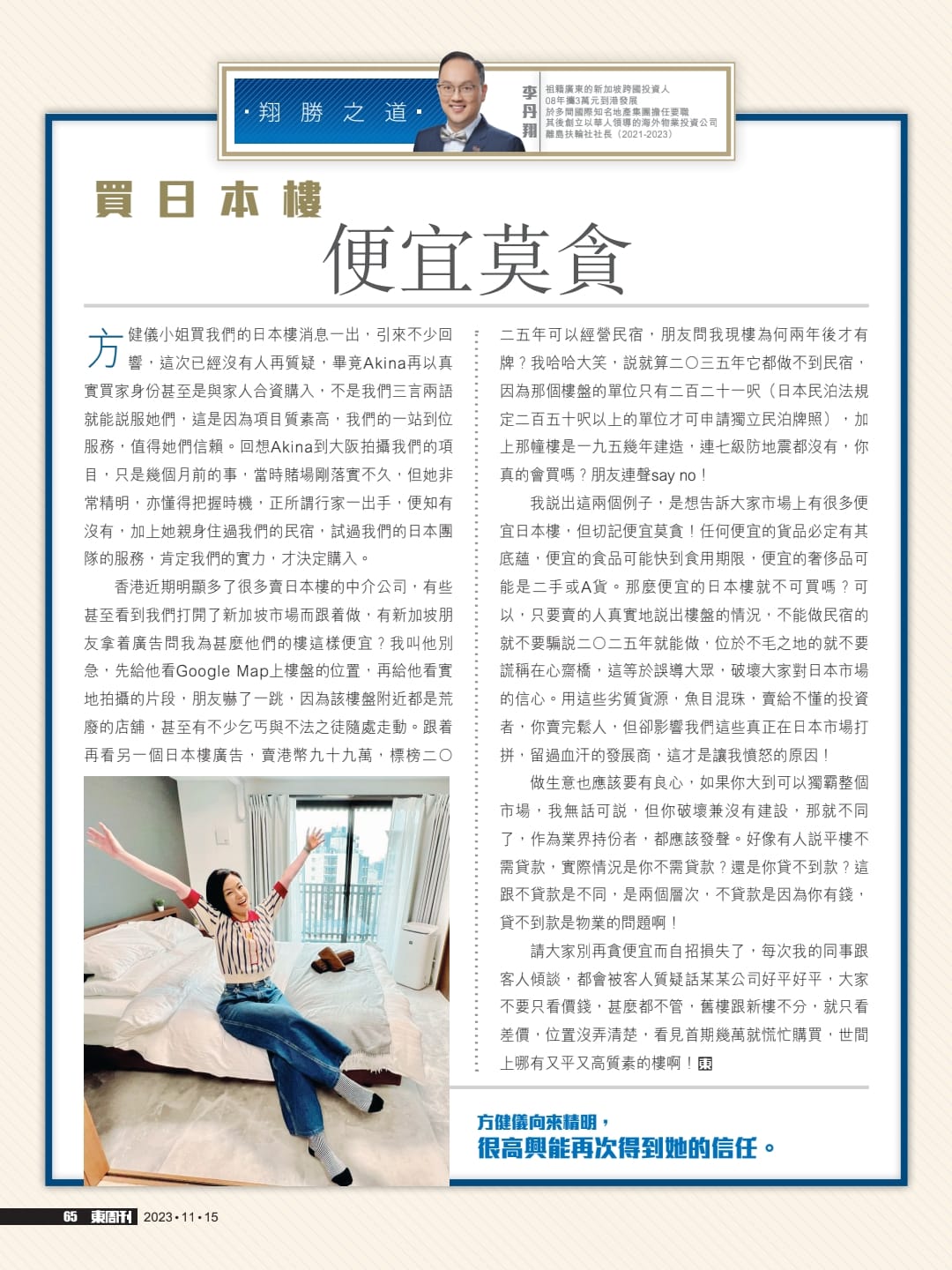 方健儀小姐買我們的日本樓消息一出,引來不少回響,這次已經沒有人再質疑,畢竟Akina再以真實買家身份甚至是與家人合資購入,不是我們三言兩語就能說服她們,這是因為項目質素高,我們的一站到位服務,值得她們信賴。回想Akina到大阪拍攝我們的項目,只是幾個月前的事,當時賭場剛落實不久,但她非常精明,亦懂得把握時機,正所謂行家一出手,便知有沒有,加上她親身住過我們的民宿,試過我們的日本團隊的服務,肯定我們的實力,才決定購入。