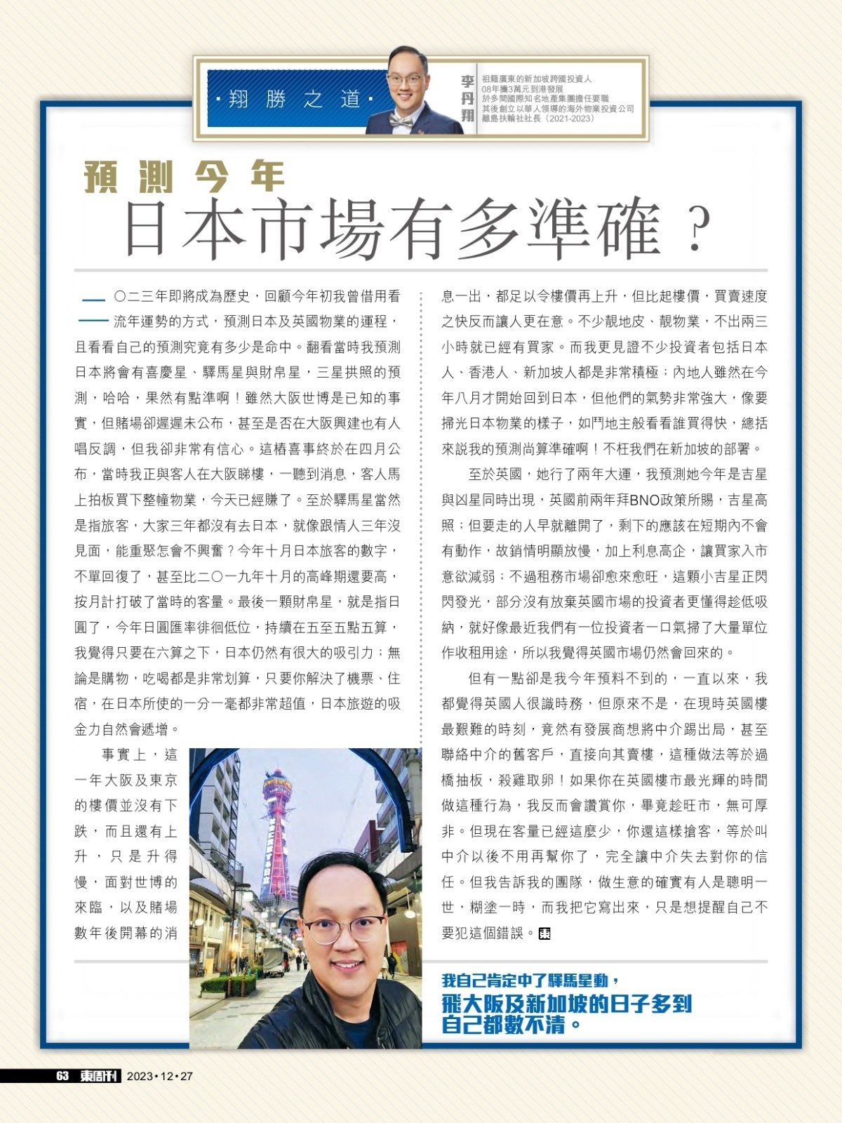 二○二三年即將成為歷史,回顧今年初我曾借用看流年運勢的方式,預測日本及英國物業的運程,且看看自己的預測究竟有多少是命中。翻看當時我預測日本將會有喜慶星、驛馬星與財帛星,三星拱照的預測,哈哈,果然有點準啊!雖然大阪世博是已知的事實,但賭場卻遲遲未公布,甚至是否在大阪興建也有人唱反調,但我卻非常有信心。這樁喜事終於在四月公布,當時我正與客人在大阪睇樓,一聽到消息,客人馬上拍板買下整幢物業,今天已經賺了。至於驛馬星當然是指旅客,大家三年都沒有去日本,就像跟情人三年沒見面,能重聚怎會不興奮?今年十月日本旅客的數字,不單回復了,甚至比二○一九年十月的高峰期還要高,按月計打破了當時的客量。最後一顆財帛星,就是指日圓了,今年日圓匯率徘徊低位,持續在五至五點五算,我覺得只要在六算之下,日本仍然有很大的吸引力;無論是購物,吃喝都是非常划算,只要你解決了機票、住宿,在日本所使的一分一毫都非常超值,日本旅遊的吸金力自然會遞增。