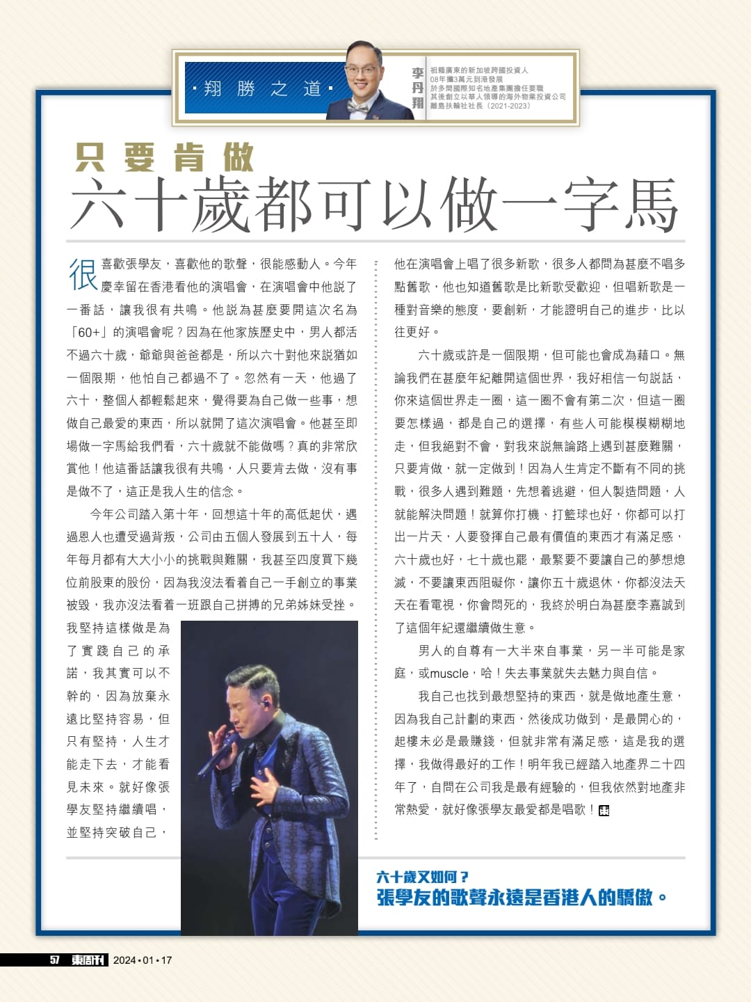 很喜歡張學友,喜歡他的歌聲,很能感動人。今年慶幸留在香港看他的演唱 會,在演唱會中他說了一番話,讓我很有共鳴。他說為甚麼要開這次名為「60+」的演唱會呢?因為在他家族歷史中,男人都活不過六十歲,爺爺與爸爸都是,所以六十對他來說尤如一個限期,他怕自己都過不了。忽然有一天,他過了六十,整個人都輕鬆起來,覺得要為自己做一些事,想做自己最愛的東西,所以就開了這次演唱會。他甚至即場做一字馬給我們看,六十歲就不能做嗎?真的非常欣賞他!他這番話讓我很有共鳴,人只要肯去做,沒有事是做不了,這正是我人生的信念。
