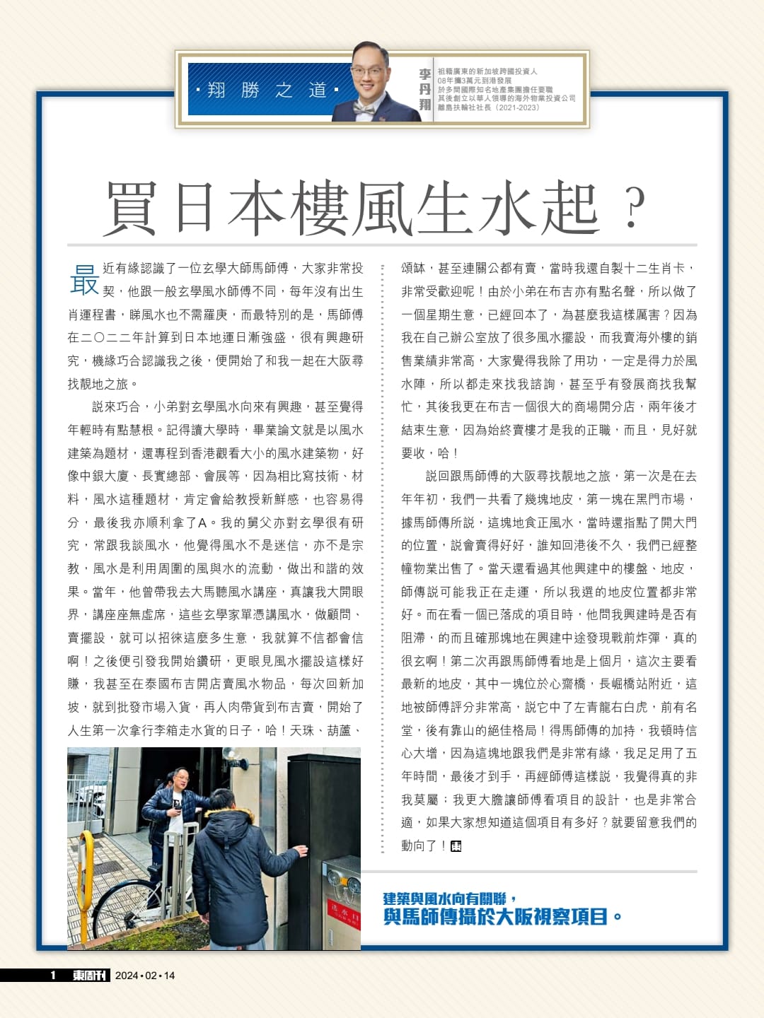最近有緣認識了一位玄學大師馬師傅,大家非常投契,他跟一般玄學風水師傅不同,每年沒有出生肖運程書,睇風水也不需羅庚,而最特別的是,馬師傅在二零二二年計算到日本地運日漸強盛,很有興趣研究,機緣巧合認識我之後,便開始了和我一起在大阪尋找靚地之旅。
