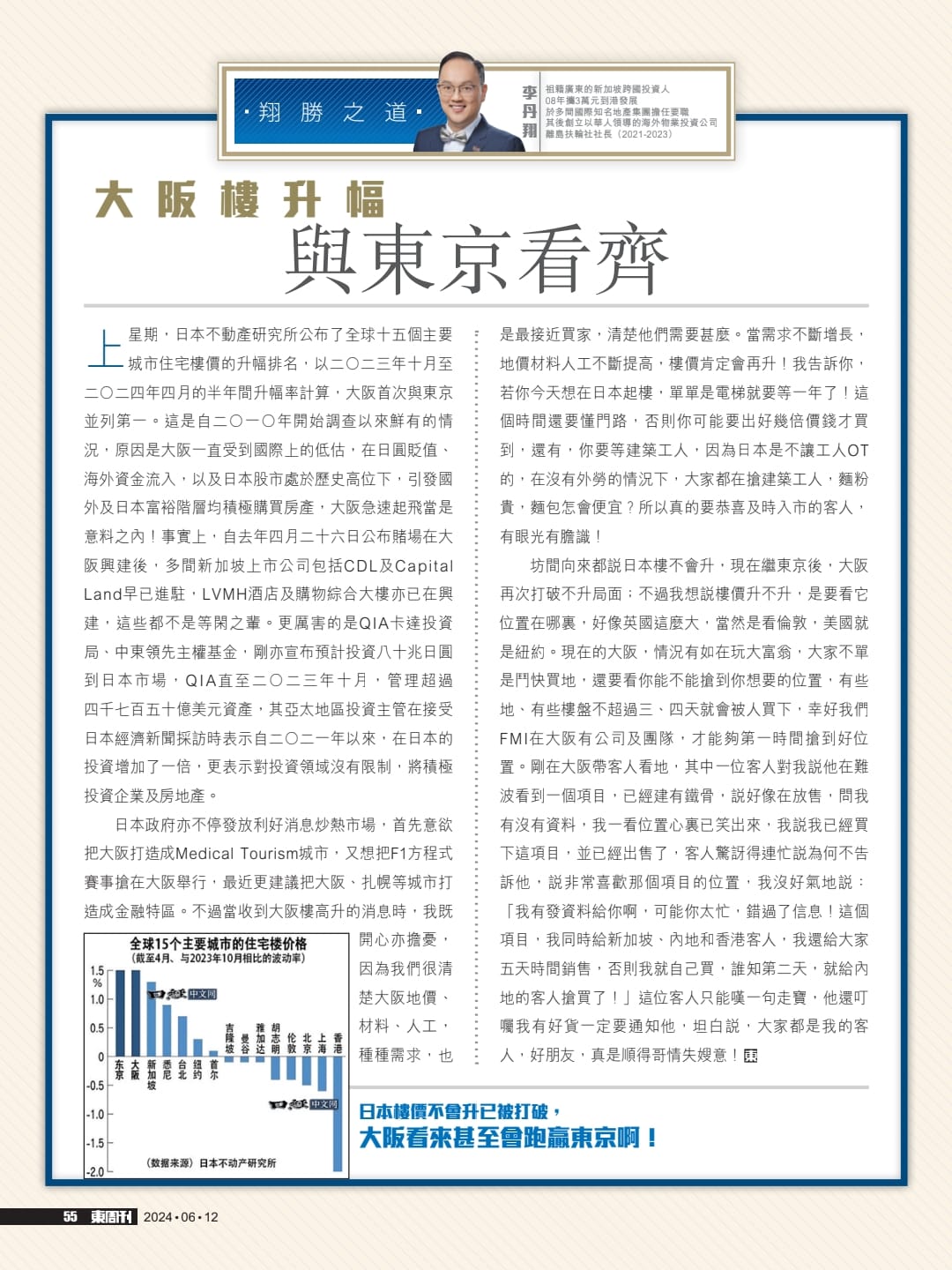 上星期,日本不動產研究所公佈了全球十五個主要城市住宅樓價的升幅排名,以二零二三年十月至二零二四年四月的半年間升幅率計算,大阪首次與東京並列第一。這是自二零一零年開始調查以來鮮有的情況,原因是大阪一直受到國際上的低估,在日圓貶值、海外資金流入,以及日本股市處於歷史高位下,引發國外及日本富裕階層均積極購買房產,大阪急速起飛當是意料之內!事實上,自去年四月二十六日公佈賭場在大阪興建後,多間新加坡上市公司包括CDL及 Capital Land早已進駐, LVMH酒店及購物綜合大樓亦已在興建,這些都不是等閑之輩。更厲害的是QIA 卡達投資局,中東領先主權基金,剛亦宣佈預計投資八十兆日圓到日本市場,QIA直至二零二三年十月,管理超過四千七百五十億美元資產,其亞太地區投資主管在接受日本經濟新聞採訪時表示自二零二一年以來,在日本的投資增加了一倍,更表示對投資領域沒有限制,將積極投資企業及房地產。