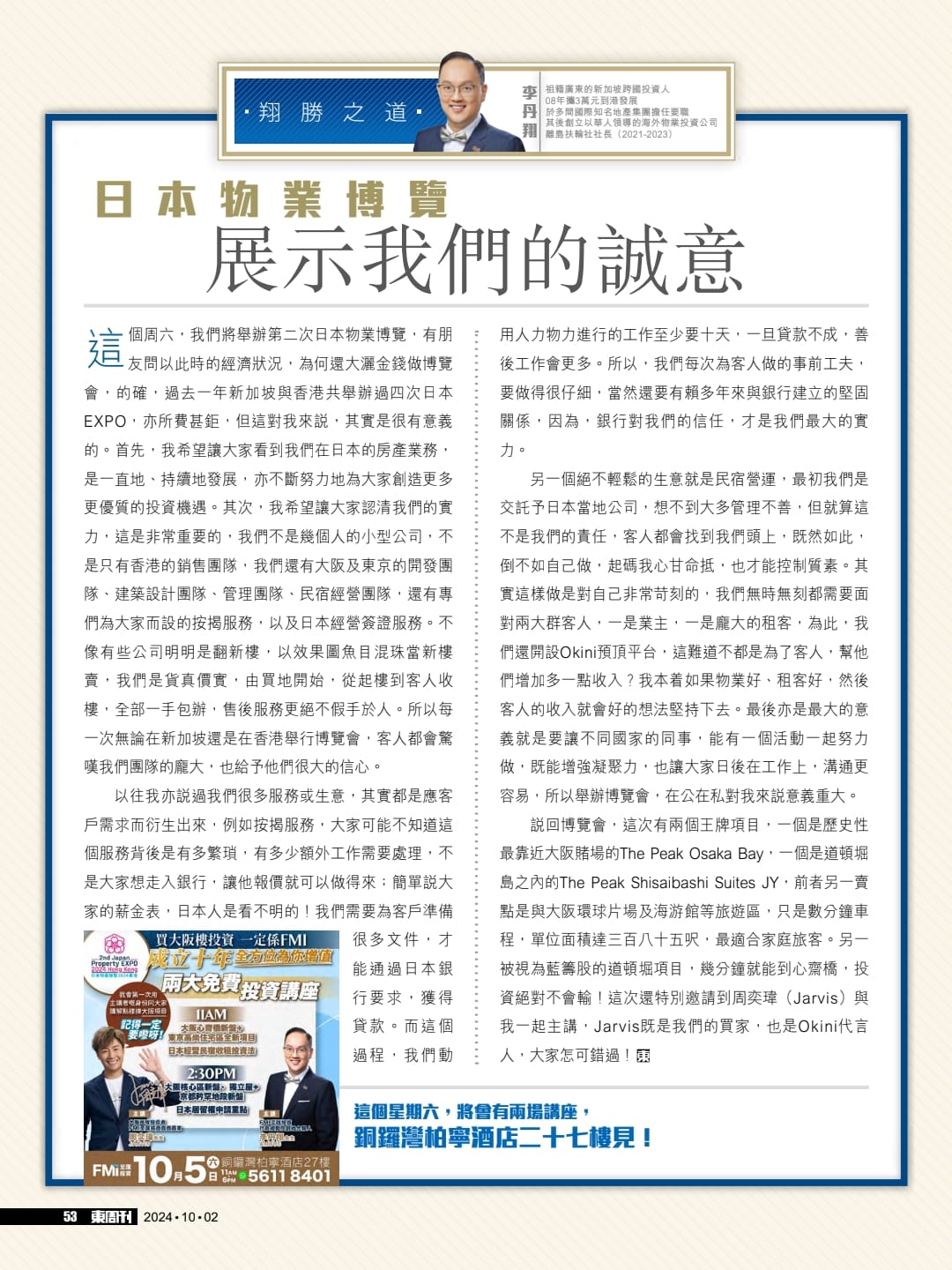說回博覽會,這次有兩個王牌項目,一個是歷史性最靠近大阪賭場的The Peak Osaka Bay,一個是道頓崛島之內的The Peak Shisaibashi Suites JY,前者另一賣點是與大阪環球片場及海游館等旅遊區,只是數分鐘車程,單位面積達三百八十五呎,最適合家庭旅客。另一被視為藍籌股的道頓堀項目,幾分鐘就能到心齋橋,-投資絕對不會輸!這次還特別邀請到周奕瑋與我一起主講,Jarvis既是我們的買家,也是Okini代言人,大家怎可錯過!