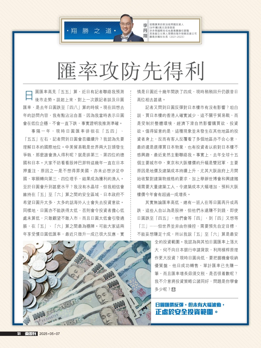 其實無論匯率高低,總有一班人在等日圓再升或再跌,這些人自以為是股神,但他們永遠賺不到錢,即使日圓跌至「四五」,他們會等「四」,到「四」又想等「三」……但世界並非由你操控,需要預先自定目標, 不能妄想賺足十成, 所以我說「五」至「六」算是最安全的投資範圍。我認為與其怕日圓匯率上落太大,何不向日本銀行申請貸款,利用槓桿原理作更大投資?現時日圓尚低,要把握機會吸納優質盤,他日成功轉售,單計匯率已先賺一筆,而且匯率增長毋須交稅,是否很着數呢?我不介意將投資策略公諸同好,問題是你學會多少呢?