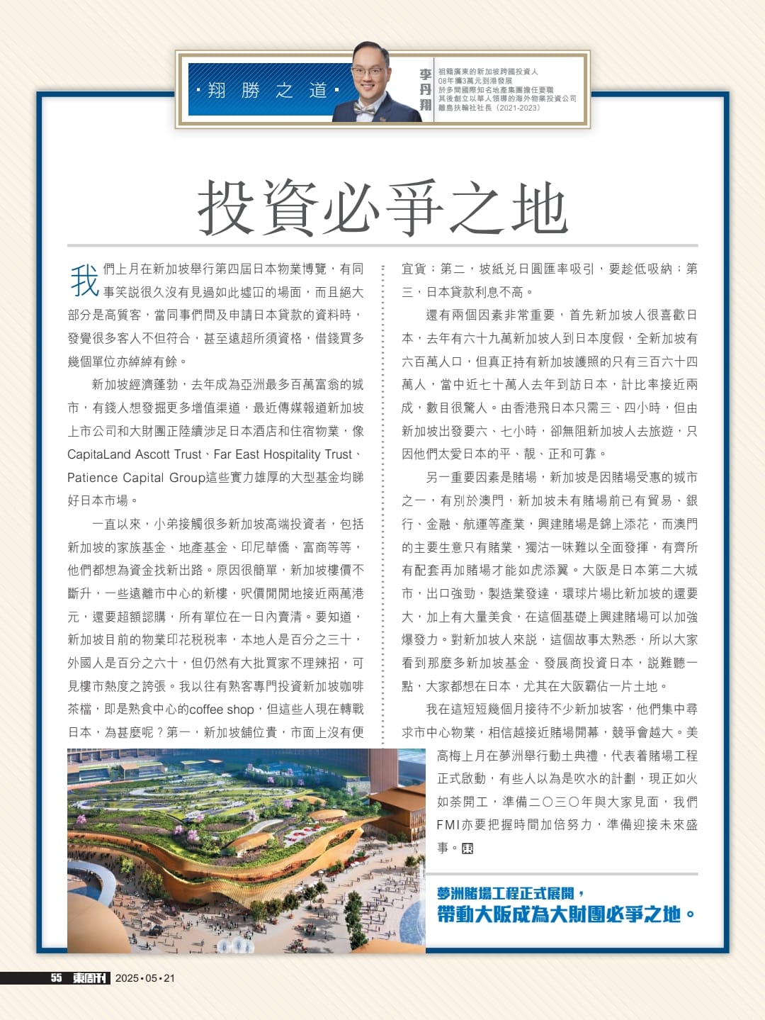 我在這短短幾個月接待不少新加坡客,他們集中尋求市中心物業,相信越接近賭場開幕,競爭會越大。美高梅上月在夢洲舉行動土典禮,代表着賭場工程正式啟動,有些人以為是吹水的計劃,現正如火如荼開工,準備二〇三〇年與大家見面,我們F MI亦要把握時間加倍努力,準備迎接未來盛事。