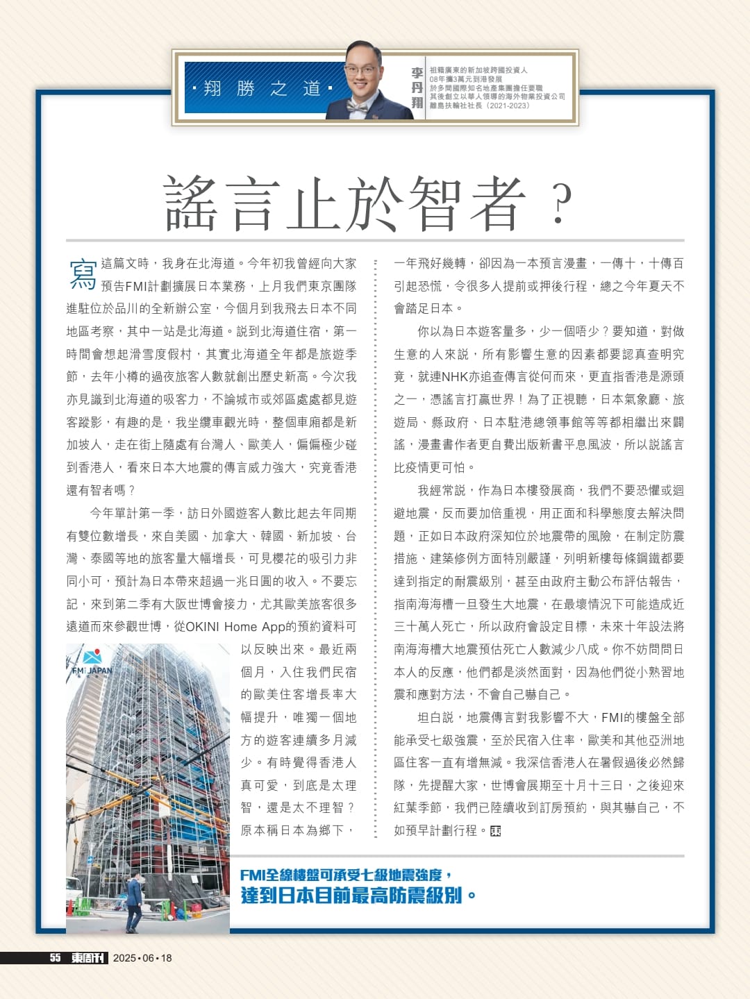 坦白說,地震傳言對我影響不大,FMI的樓盤全部能承受七級強震,至於民宿入住率,歐美和其他亞洲地區住客一直有增無減。我深信香港人在暑假過後必然歸隊,先提醒大家,世博會展期至十月十三日,之後迎來紅葉季節,我們已陸續收到訂房預約,與其嚇自己,不如預早計劃行程。