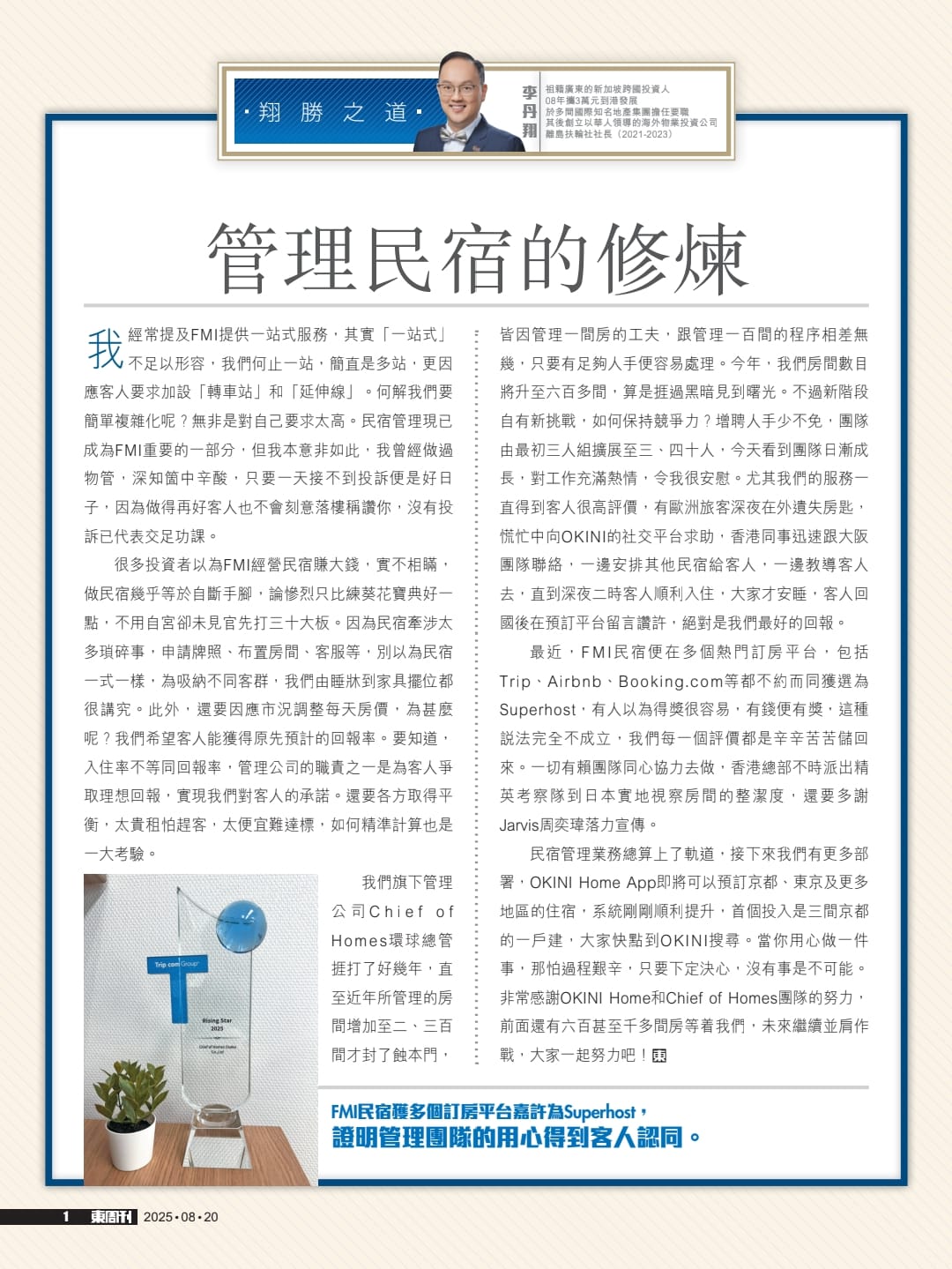 最近, FMI民宿便在多個熱門訂房平台,包括Trip、Airbnb、Booking.com等都不約而同獲選為Superhost,有人以為得獎很容易,有錢便有獎,這種說法完全不成立,我們每一個評價都是辛辛苦苦儲回來。一切有賴團隊同心協力去做,香港總部不時派出精英考察隊到日本實地視察房間的整潔度,還要多謝Jarvis周奕瑋落力宣傳。