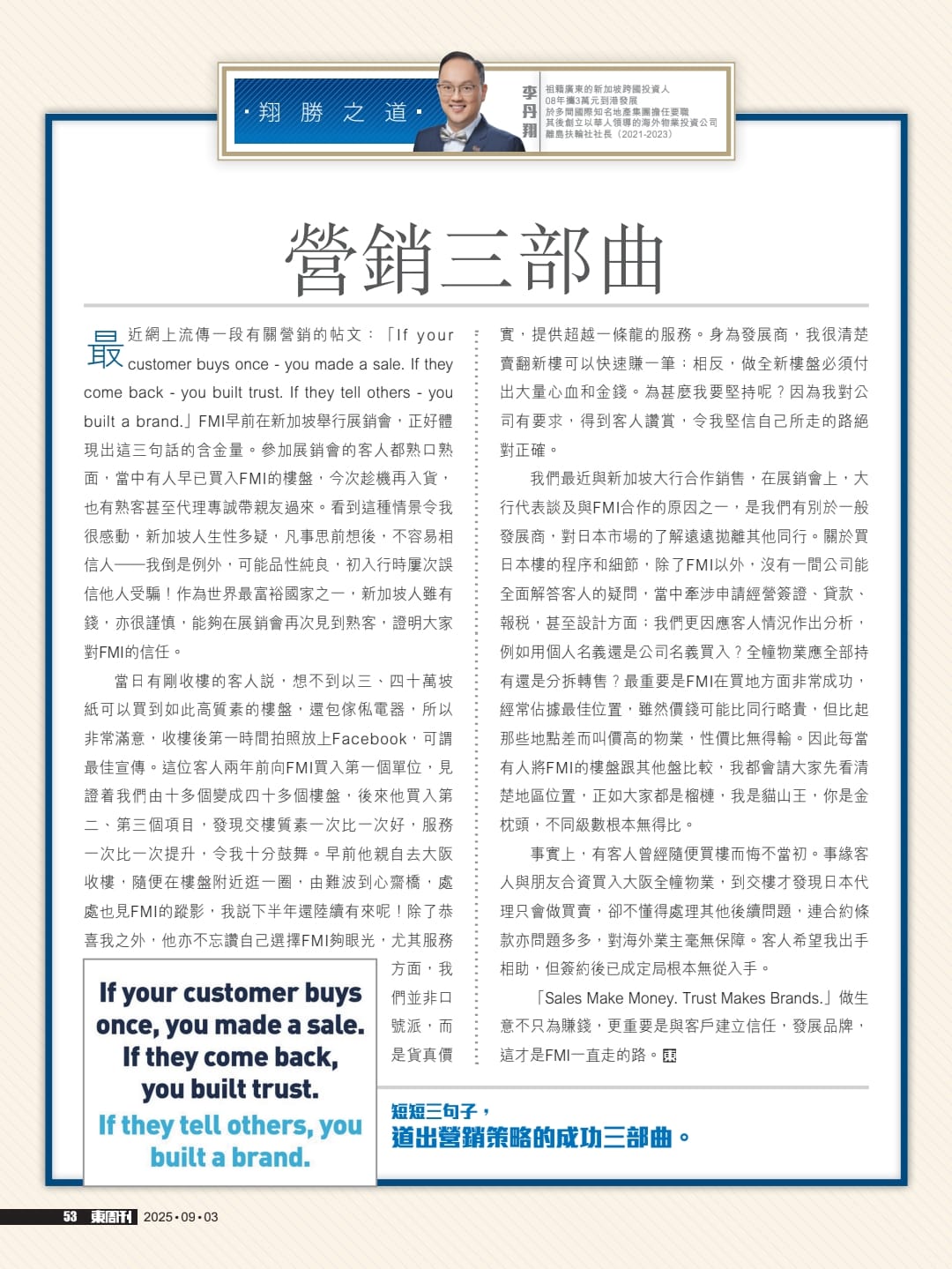 最近網上流傳一段有關營銷的帖文:「If your customer buys once -you made a sale. If they come back - you built trust. If they tell others - you built a brand.」FMI早前在新加坡舉行展銷會,正好體現出這三句話的含金量。參加展銷會的客人都熟口熟面,當中有人早已買入FMI的樓盤,今次趁機再入貨,也有熟客甚至代理專誠帶親友過來。看到這種情景令我很感動,新加坡人生性多疑,凡事思前想後,不容易相信人—我倒是例外,可能品性純良,初入行時屢次誤信他人受騙!作為世界最富裕國家之一,新加坡人雖有錢,亦很謹慎,能夠在展銷會再次見到熟客,證明大家對FMI的信任。