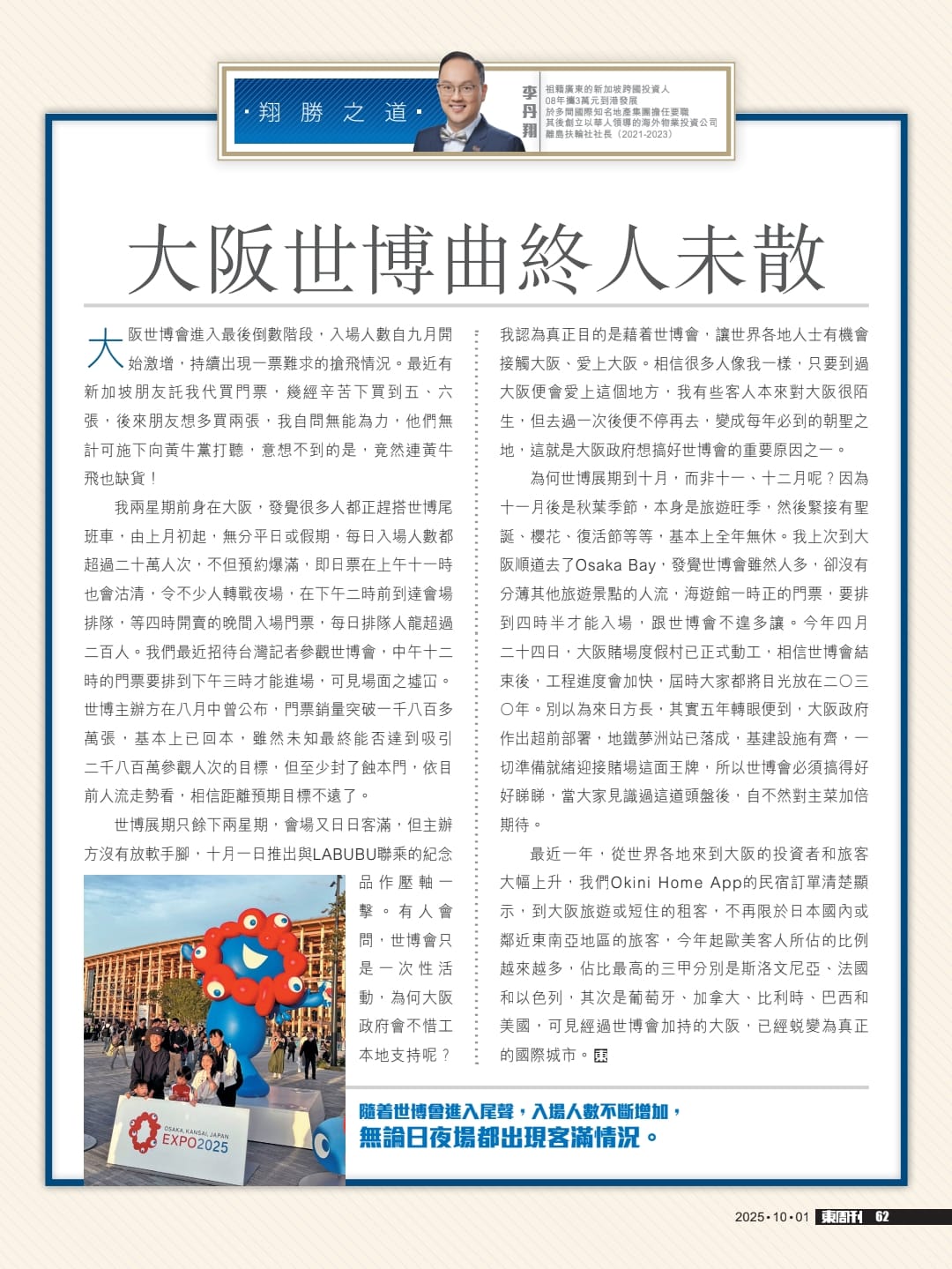 世博展期只餘下兩星期,會場又日日客滿,但主辦方沒有放軟手腳,十月一日推出與LABUBU聯乘的紀念品作壓軸一擊。有人會問,世博會只是一次性活動,為何大阪政府會不惜工本地支持呢?我認為真正目的是藉着世博會,讓世界各地人士有機會接觸大阪、愛上大阪。相信很多人像我一樣,只要到過大阪便會愛上這個地方,我有些客人本來對大阪很陌生,但去過一次後便不停再去,變成每年必到的朝聖之地,這就是大阪政府想搞好世博會的重要原因之一。