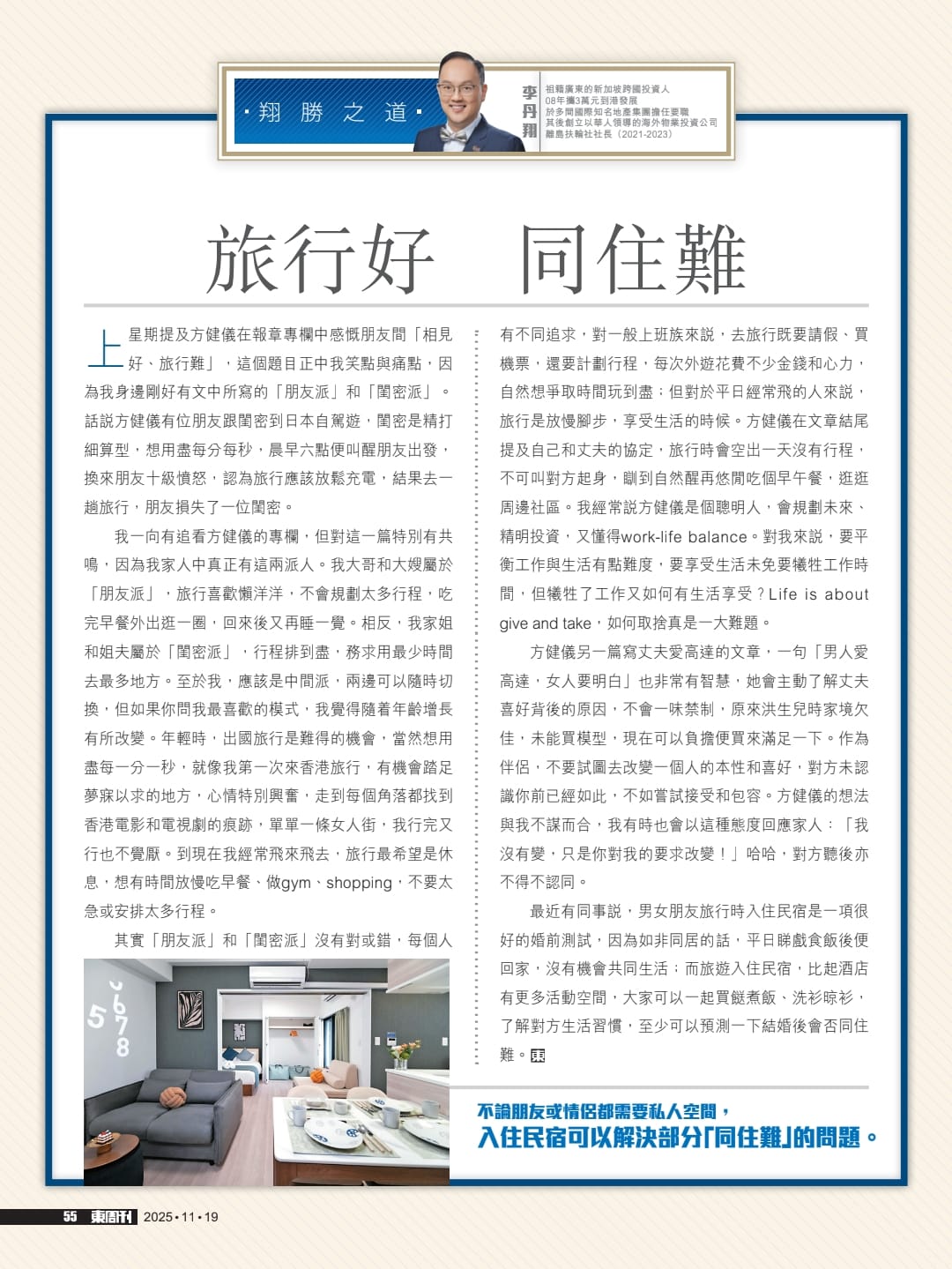 其實「朋友派」和「閨密派」沒有對或錯,每個人有不同追求,對一般上班族來說,去旅行既要請假、買機票,還要計劃行程,每次外遊花費不少金錢和心力,自然想爭取時間玩到盡;但對於平日經常飛的人來說,旅行是放慢腳步,享受生活的時候。方健儀在文章結尾提及自己和丈夫的協定,旅行時會空出一天沒有行程,不可叫對方起身,瞓到自然醒再悠閒吃個早午餐,逛逛周邊社區。我經常說方健儀是個聰明人,會規劃未來、精明投資,又懂得work-life balance。對我來說,要平衡工作與生活有點難度,要享受生活未免要犧牲工作時間,但犧牲了工作又如何有生活享受?Life is about give and take,如何取捨真是一大難題。