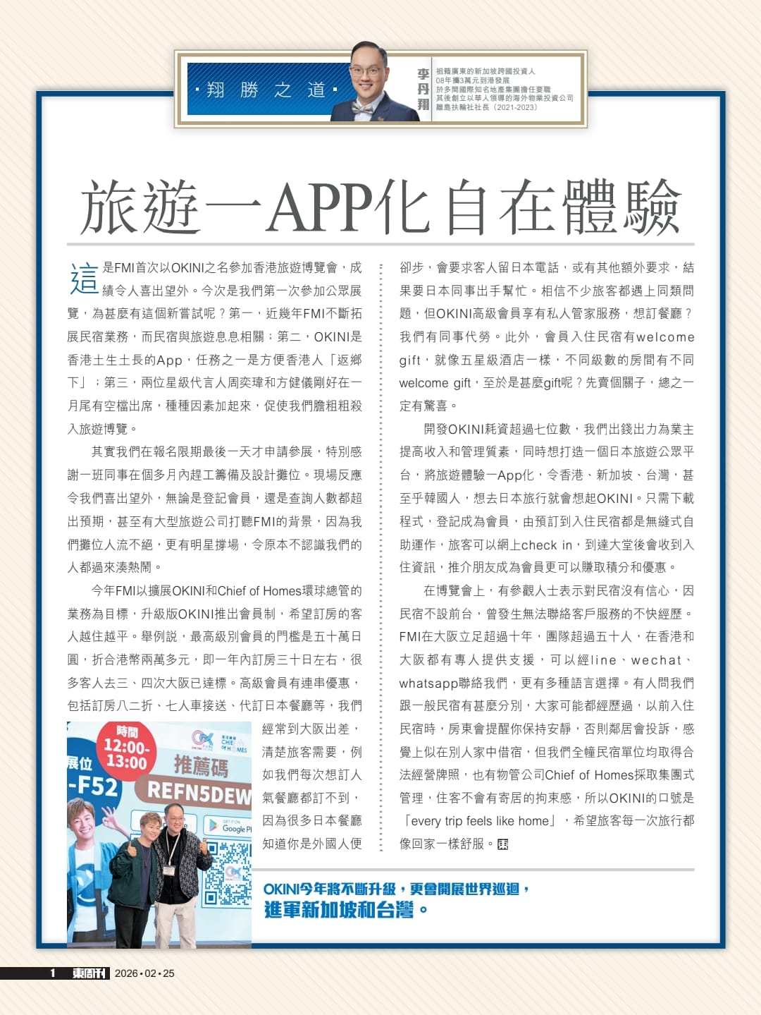 這是FMI首次以OKINI之名參加香港旅遊博覽會,成績令人喜出望外。今次是我們第一次參加公眾展覽,為甚麼有這個新嘗試呢?第一,近幾年FMI不斷拓展民宿業務,而民宿與旅遊息息相關;第二,OKINI是香港土生土長的App,任務之一是方便香港人「返鄉下」;第三,兩位星級代言人周奕瑋和方健儀剛好在一月尾有空檔出席,種種因素加起來,促使我們膽粗粗殺入旅遊博覽。