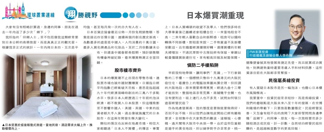 有人質疑日本股市是另一輪泡沫,也擔心日本樓市風險極高,我要重申,投資民宿並非短炒,而是長線投資,我們的着眼點是大阪未來八至十年的發展,在世博和賭場的帶動下,只要旅客數量穩定,民宿經營妥善,又怎會有租不出的房間﹖大家即管問問身邊準備「返鄉下」的同事、朋友,每一次旅程要花多少錢租酒店或民宿,計一計數,自然明白經營民宿所賺的,是超越帳面數字的更高回報!