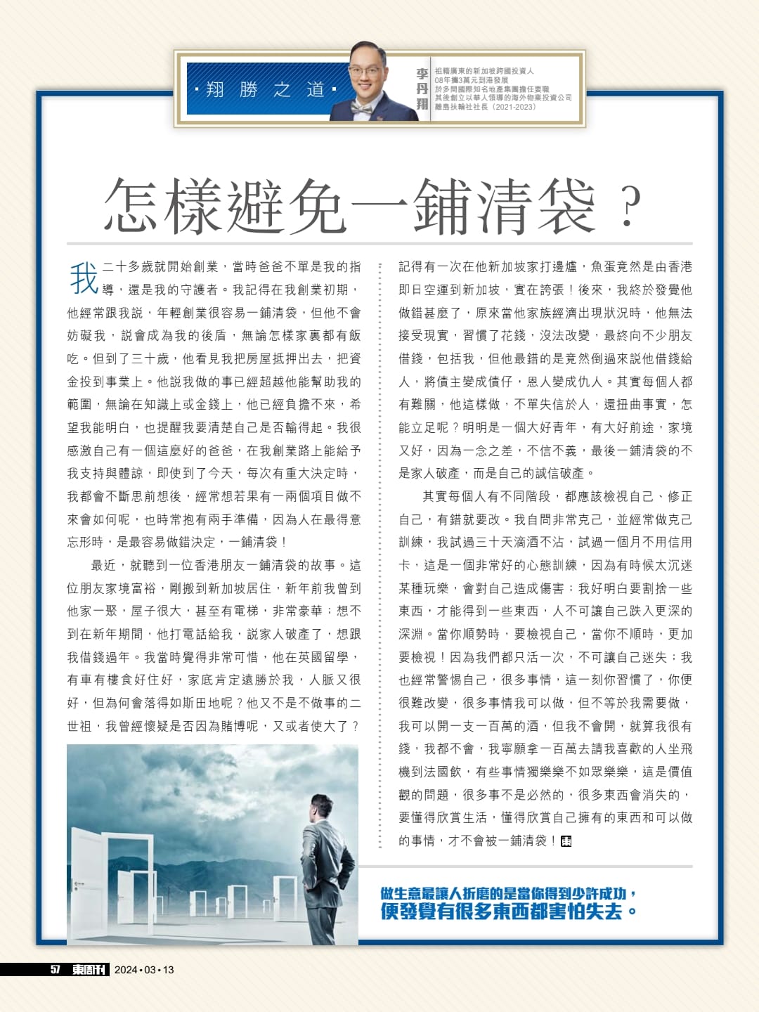 我二十多歲就開始創業,當時爸爸不單是我的指導,還是我的守護者。我記得在我創業初期,他經常跟我說,年輕創業很容易一鋪清袋,但他不會防礙我,說會成為我的後盾,無論怎樣家裡都有飯吃。但到了三十歲,他看見我把房屋抵押出去,把資金投到事業上。他說我做的事已經超越他能幫助我的範圍,無論在知識上或金錢上,他已經負擔不來,希望我能明白,也提醒我要清楚自己是否輸得起。我很感激自己有一個這麼好的爸爸,在我創業路上能給予我支持與體諒,即使到了今天,每次有重大決定時,我都會不斷思前想後,經常想若果有一兩個項目做不來會如何呢,也時常抱有兩手準備,因為人在最得意忘形時,是最容易做錯決定,一鋪清袋!