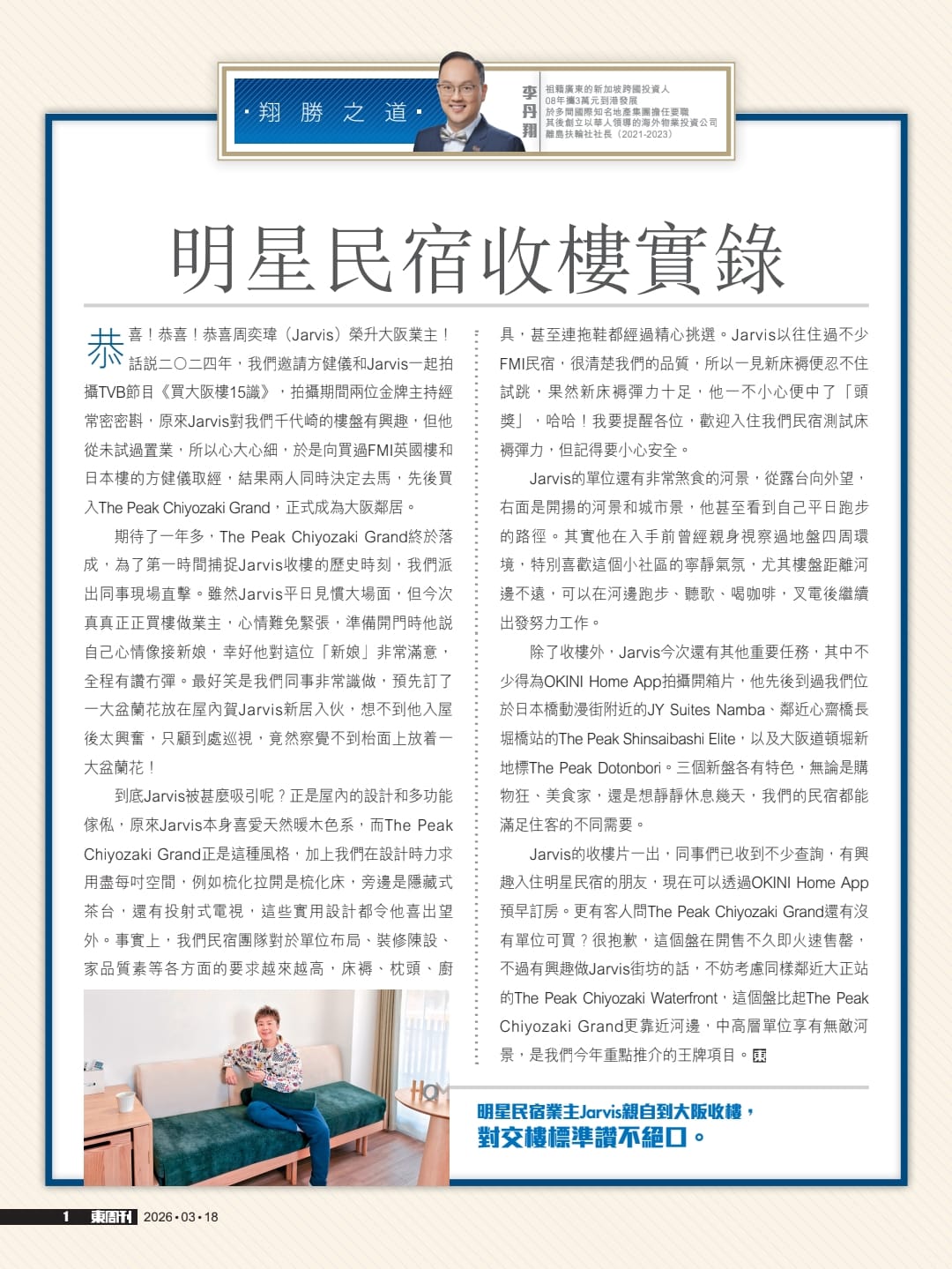 恭喜!恭喜!恭喜周奕瑋(Jarvis)榮升大阪業主!話說二○二四年,我們邀請方健儀和Jarvis一起拍攝TVB節目《買大阪樓15識》,拍攝期間兩位金牌主持經常密密斟,原來Jarvis對我們千代崎的樓盤有興趣,但他從未試過置業,所以心大心細,於是向買過FMI英國樓和日本樓的方健儀取經,結果兩人同時決定去馬,先後買入The Peak Chiyozaki Grand,正式成為大阪鄰居。