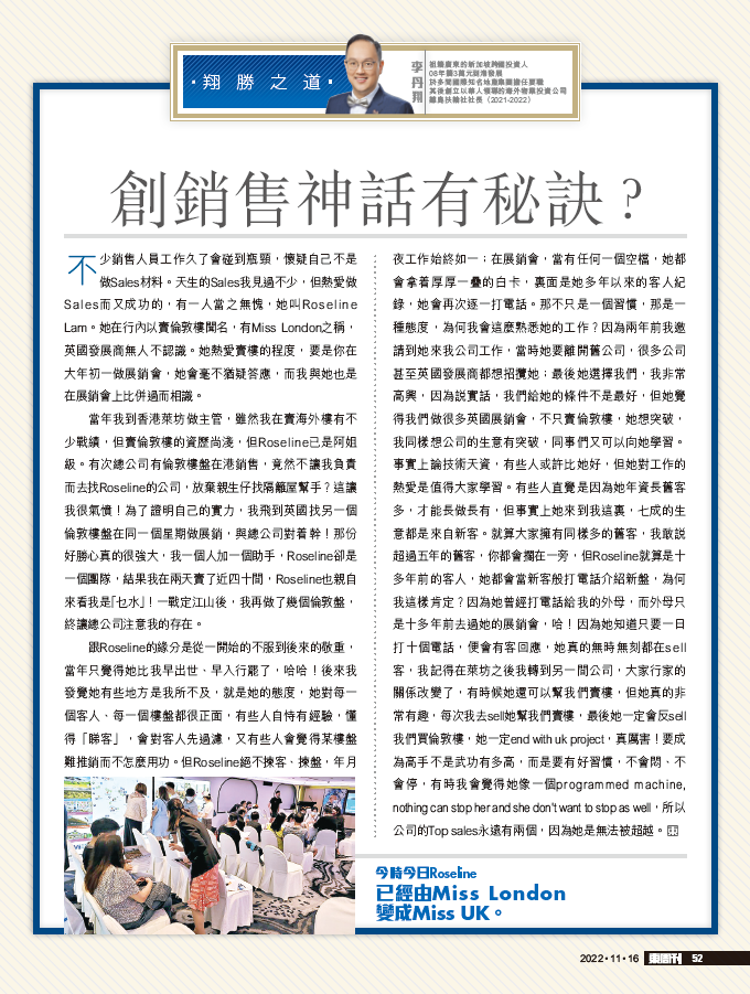 跟Rosaline的緣分是從一開始的不服到後來的敬重,當年只覺得她比我早出世、早入行罷了,哈哈!後來我發覺她有些地方是我所不及,就是她的態度,她對每一個客人、每一個樓盤都很正面,有些人自恃有經驗,懂得「睇客」,會對客人先過濾,又有些人會覺得某樓盤難推銷而不怎麼用功。但Rosaline絕不揀客、揀盤,年月夜工作始終如一;在展銷會,當有任何一個空檔,她都會拿着厚厚一疊的白卡,裏面是她多年以來的客人紀錄,她會再次逐一打電話。那不只是一個習慣,那是一種態度,為何我會這麼熟悉她的工作?因為兩年前我邀請到她來我公司工作,當時她要離開舊公司,很多公司甚至英國發展商都想招攬她;最後她選擇我們,我非常高興,因為說實話,我們給她的條件不是最好,但她覺得我們做很多英國展銷會,不只賣倫敦樓,她想突破,我同樣想公司的生意有突破,同事們又可以向她學習。事實上論技術天資,有些人或許比她好,但她對工作的熱愛是值得大家學習。有些人直覺是因為她年資長舊客多,才能長做長有,但事實上她來到我這裏,七成的生意都是來自新客。就算大家擁有同樣多的舊客,我敢說超過五年的舊客,你都會擱在一旁,但Rosaline就算是十多年前的客人,她都會當新客般打電話介紹新盤,為何我這樣肯定?因為她曾經打電話給我的外母,而外母只是十多年前去過她的展銷會,哈!因為她知道只要一日打十個電話,便會有客回應,她真的無時無刻都在sell客,我記得在萊坊之後我轉到另一間公司,大家行家的關係改變了,有時候她還可以幫我們賣樓,但她真的非常有趣,每次我去sell她幫我們賣樓,最後她一定會反sell我們買倫敦樓,她一定end with uk project,真厲害!要成為高手不是武功有多高,而是要有好習慣,不會悶、不會停,有時我會覺得她像一個programmed machine, nothing can stop her and she don't want to stop as well,所以公司的Top sales永遠有兩個,因為她是無法被超越。