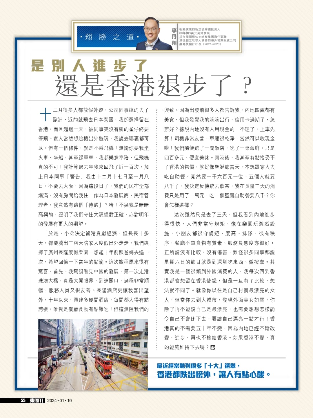 十二月很多人都放假外遊,公司同事遠的去了歐洲,近的就飛去日本泰國,我卻選擇留在香港,而且超過十天,被同事笑沒有腳的雀仔終要停飛。家人當然想趁機出外遊玩,我說去哪裡都可以,但有一個條件,就是不乘飛機!無論你要我坐火車、坐船,甚至踩單車,我都樂意奉陪,但飛機真的不可!我計算過去年我來回飛了近一百次,加上日本同事「警告」我由十二月十七日至一月八日,不要去大阪,因為這段日子,我們的民宿全部爆滿,沒有房間給我住,作為日本發展商、民宿管理者,我竟然有這個「待遇」?哈!不過我是暗暗高興的,證明了我們守住大阪絕對正確,亦對明年的發展有更大的期望。