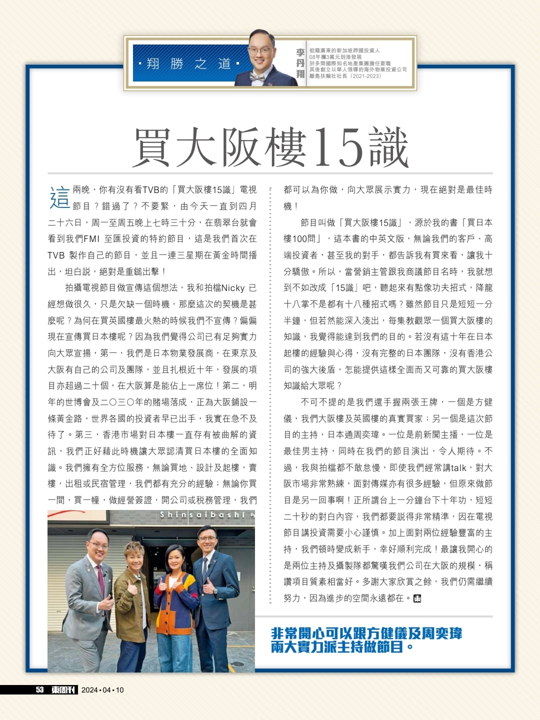 這兩晚,你有沒有看TVB的「買大阪樓15識」電視節目?錯過了?不要緊,由今天一直到四月二十六日,周一至周五晚上七時三十分,在 翡翠台就會看到我們FMI 至匯投資的特約節目,這是我們首次在TVB 製作自己的節目,並且一連三星期在黃金時間播出,坦白說,絕對是重搥出擊!