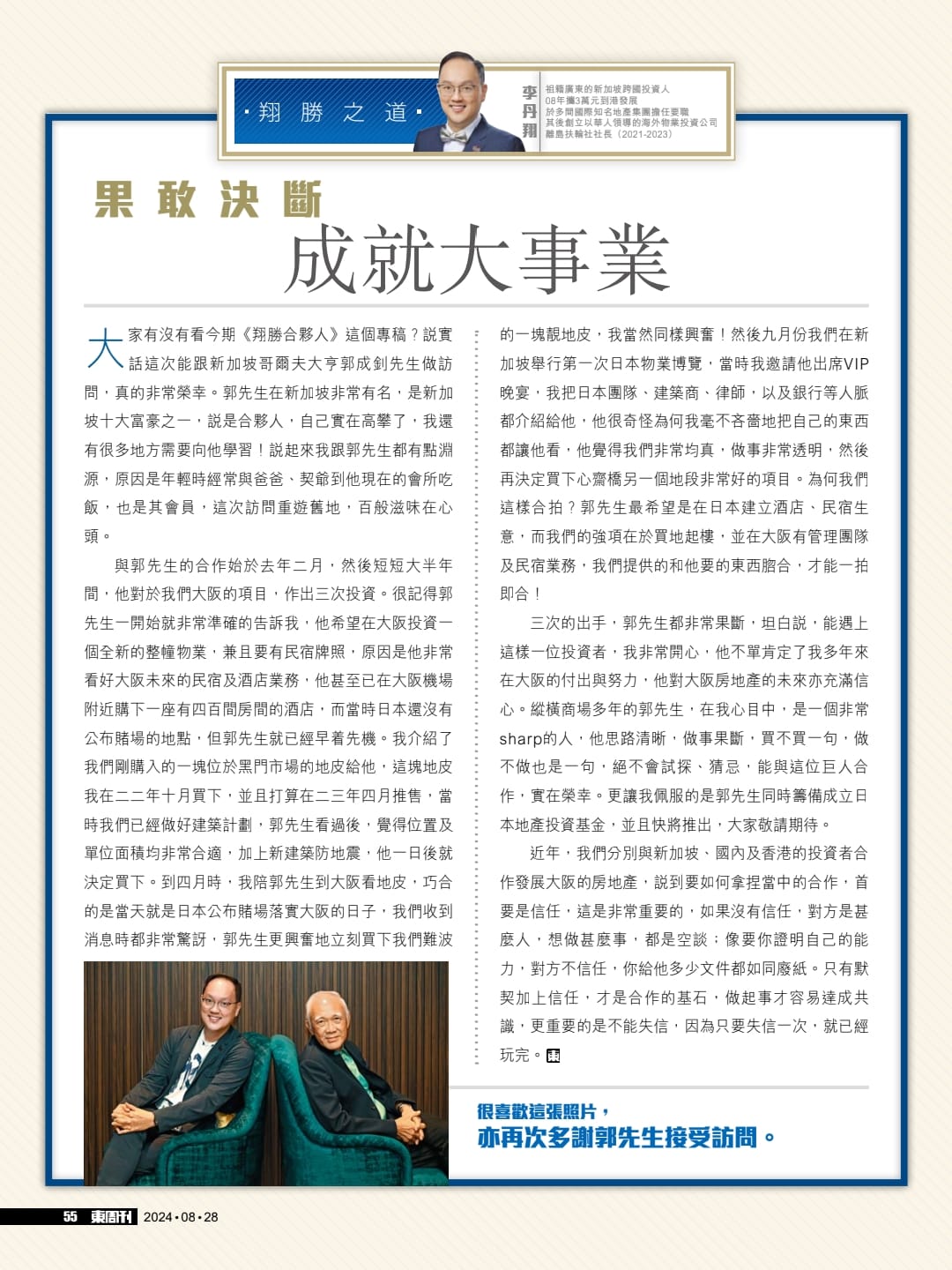 三次的出手,郭先生都非常果斷,坦白說,能遇上這樣一位投資者,我非常開心,他不單肯定了我多年來在大阪的付出與努力,他對大阪房地產的未來亦充滿信心。縱橫商場多年的郭先生,在我心目中,是一個非常sharp的人,他思路清晰,做事果斷,買不買一句,做不做也是一句,絕不會試探、猜忌,能與這位巨人合作,實在榮幸。更讓我佩服的是郭先生同時籌備成立日本地產投資基金,並且快將推出,大家敬請期待。