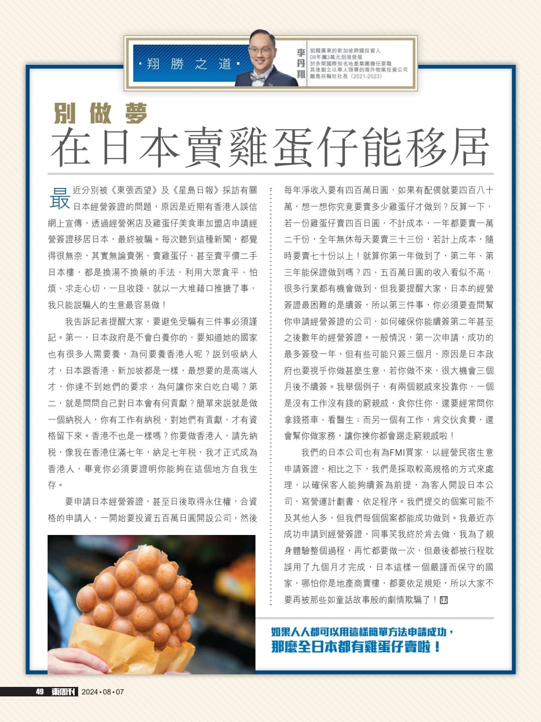 最近分別被東張西望及星島日報採訪有關日本經營簽證的問題,原因是近期有香港人誤信網上宣傳,透過經營粥店及雞蛋仔美食車加盟店申請經營簽證移居日本,最終被騙。每次聽到這種新聞,都覺得很無奈,其實無論賣粥、賣雞蛋仔,甚至賣平價二手日本樓,都是換湯不換藥的手法,利用大眾貪平、怕煩、求走心切,一旦收錢,就以一大堆藉口推搪了事,我只能說騙人的生意最容易做!