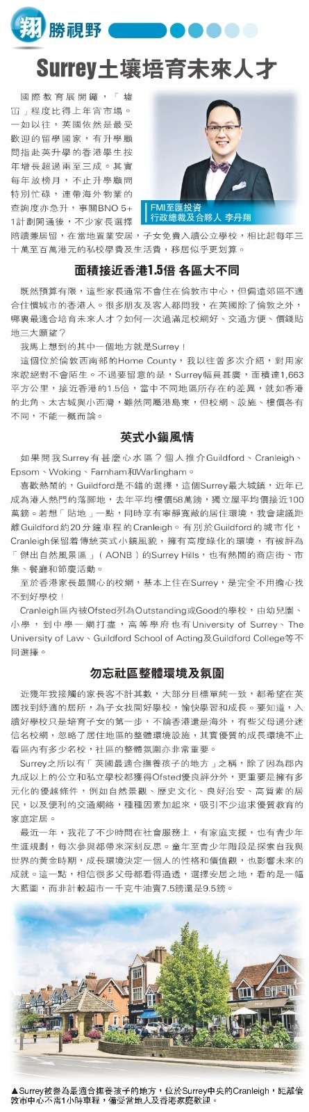 既然預算有限,這些家長通常不會住在倫敦市中心,但偏遠郊區不適合住慣城市的香港人。很多朋友及客人都問我,在英國除了倫敦之外,哪裡最適合培育未來人才﹖如何一次過滿足校網好、交通方便、價錢貼地三大願望﹖我馬上想到的其中一個地方就是Surrey!