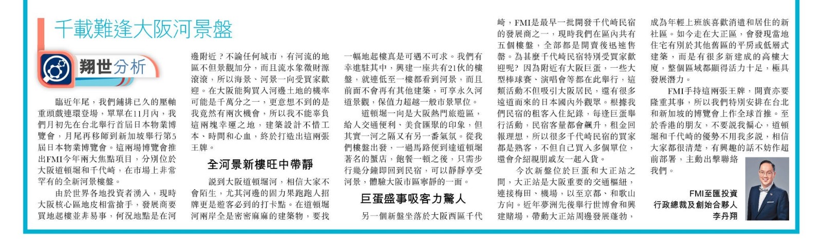 臨近年尾,我們鋪排已久的壓軸重頭戲連環登場,單單在十一月內,我們月初先在台北舉行首屆日本物業博覽會,月尾再移師到新加坡舉行第五屆日本物業博覽會。這兩場博覽會推出FMI今年兩大焦點項目,分別位於大阪道頓堀和千代崎,在市場上非常罕有的全新河景樓盤。