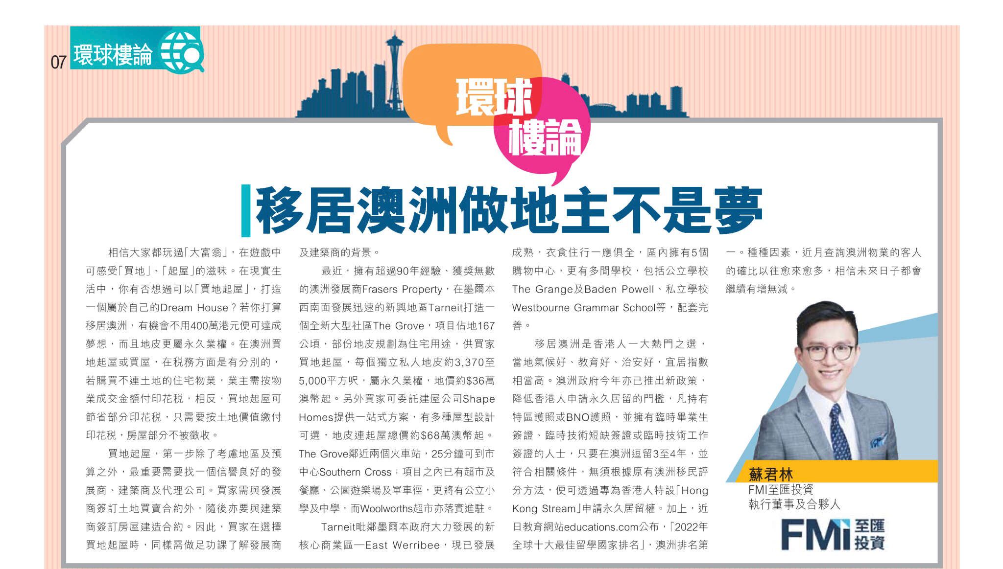 最近,擁有超過90年經驗、獲獎無數的澳洲發展商Frasers Property,在墨爾本西南面發展迅速的新興地區Tarneit打造一個全新大型社區The Grove,項目佔地167公頃,部份地皮規劃為住宅用途,供買家買地起屋,每個獨立私人地皮約3,370至5,000平方呎,屬永久業權,地價約$36萬澳幣起。另外買家可委託建屋公司Shape Homes提供一站式方案,有多種屋型設計可選,地皮連起屋總價約$68萬澳幣起。The Grove鄰近兩個火車站,25分鐘可到市中心Southern Cross;項目之內已有超市及餐廳, 公園遊樂場及單車徑,更將有公立小學及中學,而Woolworths超市亦落實進駐。