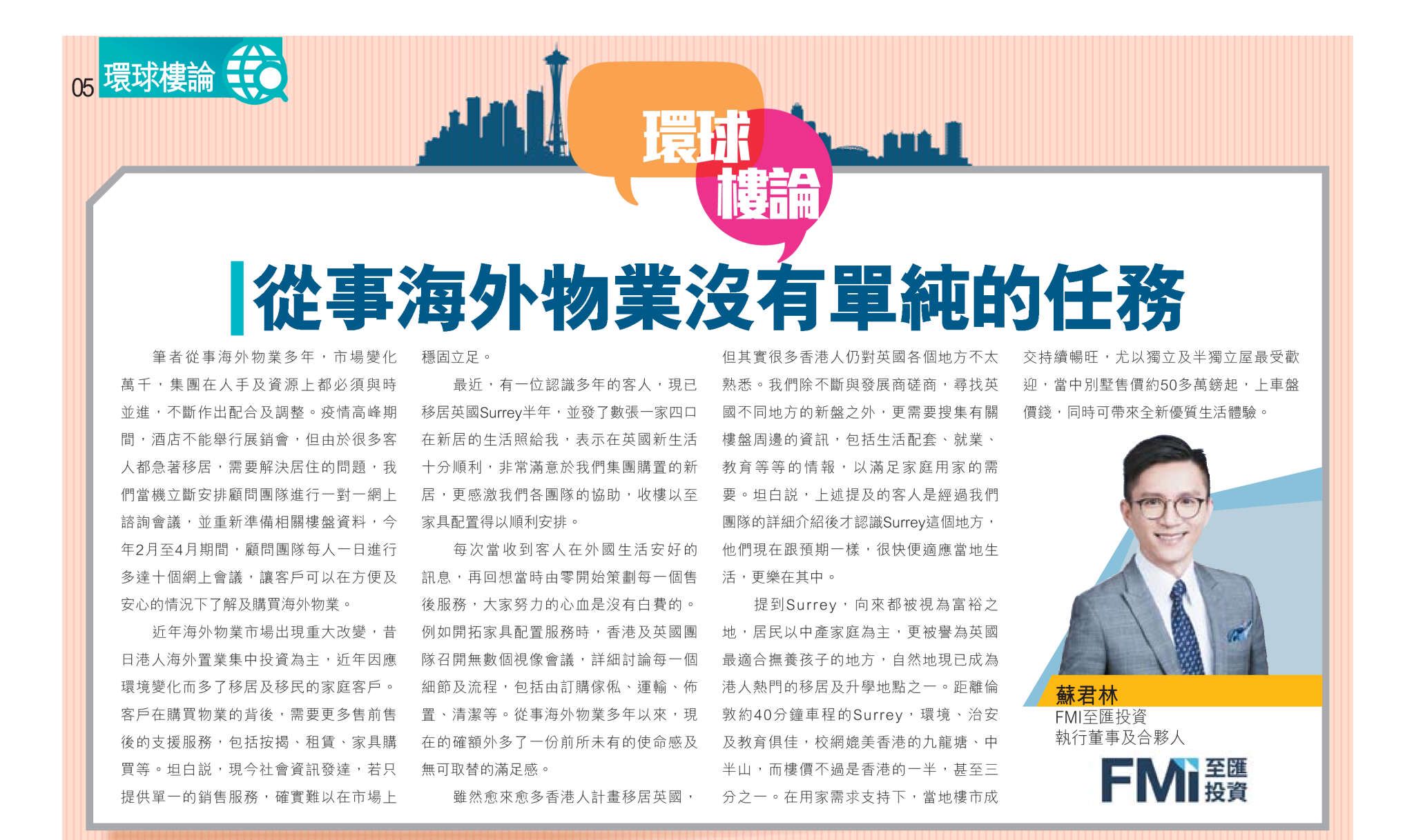 筆者從事海外物業多年,市場變化萬千,集團在人手及資源上都必須與時並進,不斷作出配合及調整。疫情高峰期間,酒店不能舉行展銷會,但由於很多客人都急著移居,需要解決居住的問題,我們當機立斷安排顧問團隊進行一對一網上諮詢會議,並重新準備相關樓盤資料,今年2月至4月期間,顧問團隊每人一日進行多達十個網上會議,讓客戶可以在方便及安心的情況下了解及購買海外物業。