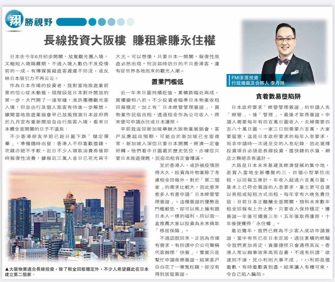 《明報》「翔勝視野」專欄 —長線投資大阪樓賺租兼賺永住權