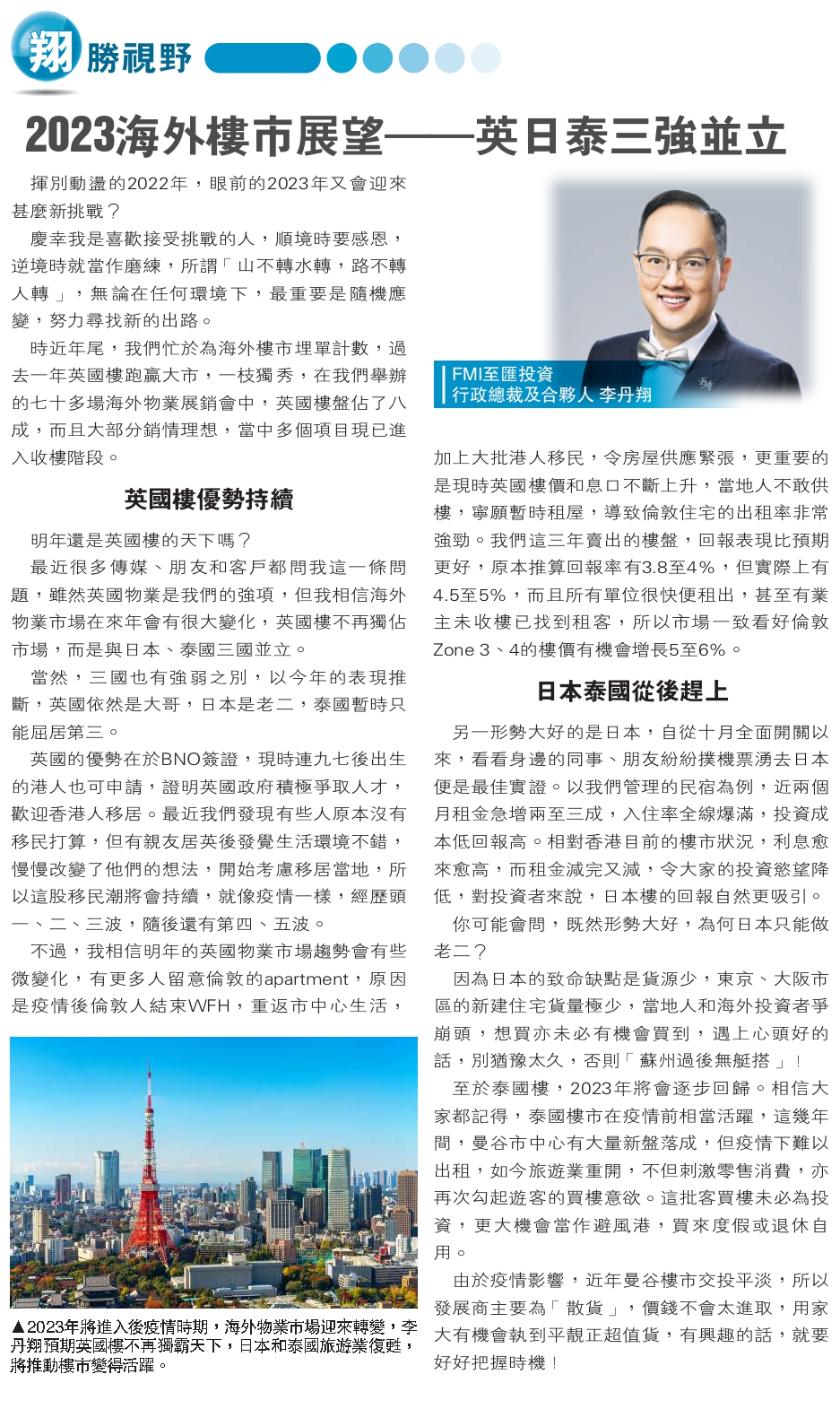 至於泰國樓,2023年將會逐步回歸。相信大家都記得,泰國樓市在疫情前相當活躍,這幾年間,曼谷市中心有大量新盤落成,但疫情下難以出租,如今旅遊業重開,不但刺激零售消費,亦再次勾起遊客的買樓意欲。這批客買樓未必為投資,更大機會當作避風港,買來度假或退休自用。