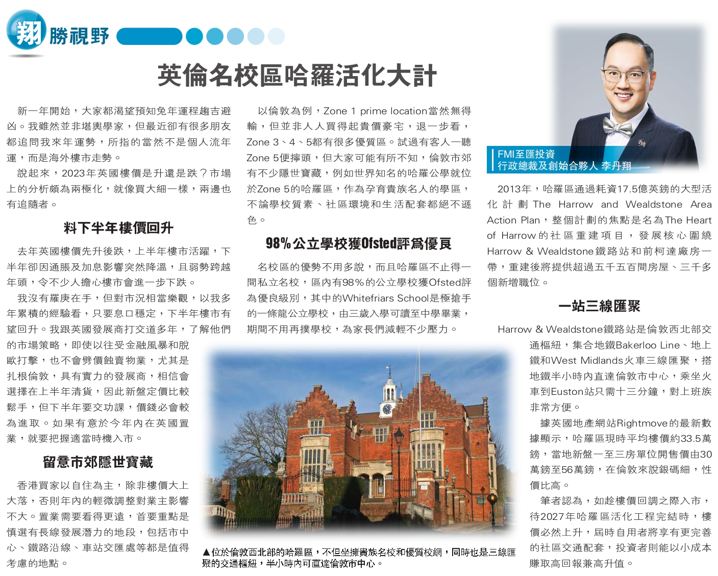 香港買家以自住為主,除非樓價大上大落,否則年內的輕微調整對業主影響不大。置業需要看得更遠,首要重點是慎選有長線發展潛力的地段,包括市中心、鐵路沿線、車站交匯處等都是值得考慮的地點。以倫敦為例,Zone 1 prime location當然無得輸,但並非人人買得起貴價豪宅,退一步看,Zone 3、4、5都有很多優質區。試過有客人一聽Zone 5便擰頭,大家可能有所不知,倫敦市郊有不少隱世寶藏,例如世界知名的哈羅公學就位於Zone 5的哈羅區,作為孕育貴族名人的學區,不論學校質素、社區環境和生活配套都絕不遜色。