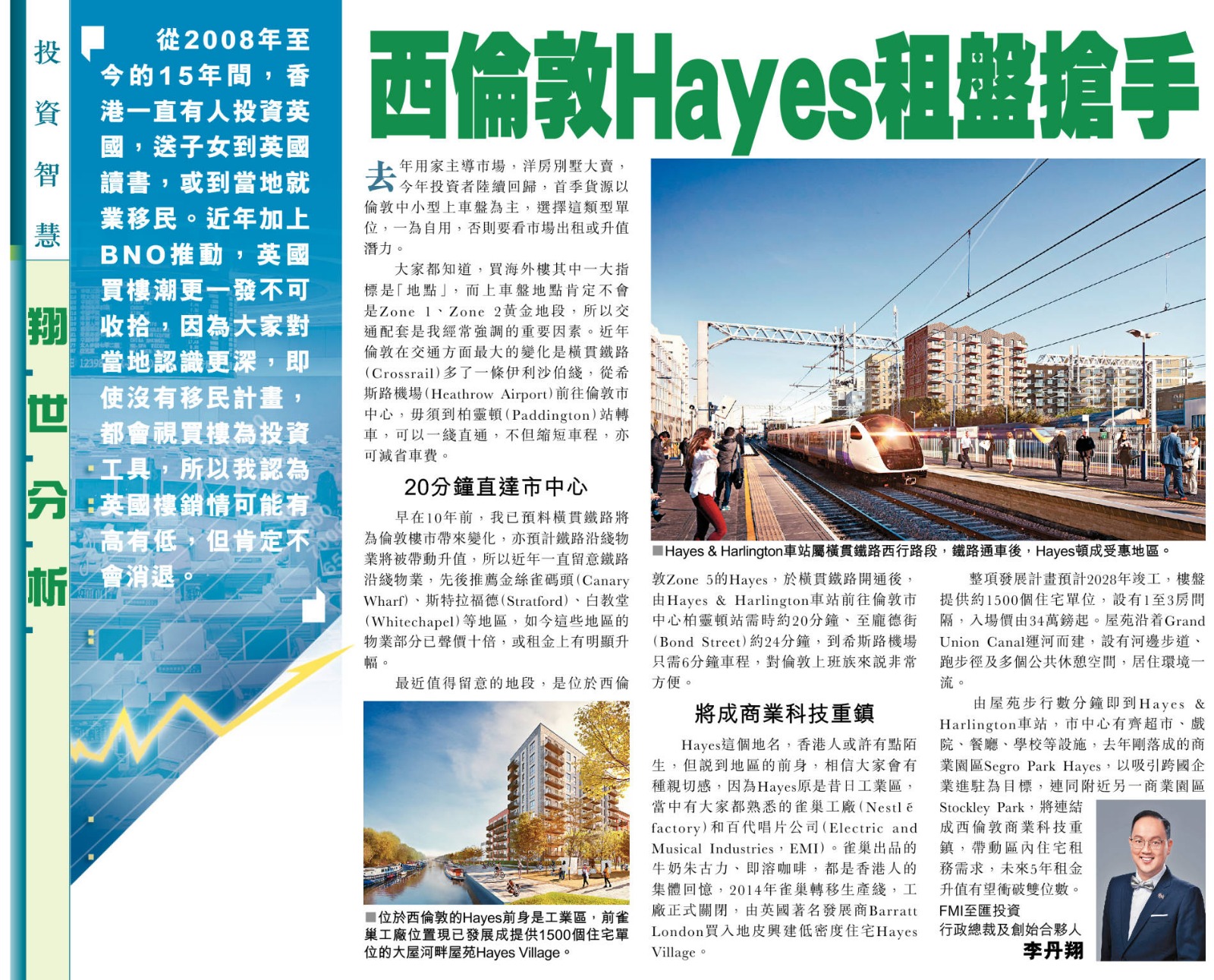 《星島日報投資王周刊》專欄「翔世分析」 — 西倫敦Hayes 新興社區租盤搶手