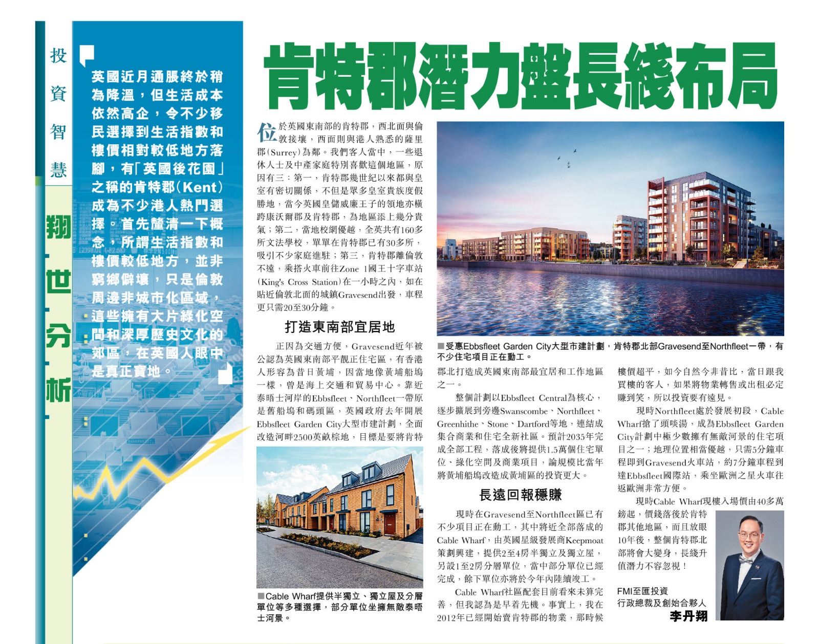Cable Wharf的社區配套在目前看來未算完善,但我認為是早着先機。事實上,我在2012年已經開始賣肯特郡的物業,那時候樓價超平,如今自然今非昔比,當日跟我買樓的客人,如果將物業轉售或出租必定賺到笑,所以投資要有遠見。現時 Northfleet處於發展初段,Cable Wharf搶了頭啖湯,成為Ebbsfleet Garden City計劃中極少數擁有無敵河景的住宅項目之一;地理位置相當優越,只需五分鐘車程即到Gravesend火車站,約七分鐘車程到達Ebbsfleet國際站,乘坐歐洲之星火車往返歐洲非常方便。現時Cable Wharf現樓入場價由四十多萬鎊起,價錢落後於肯特郡其他地區,而且放眼十年後,整個肯特郡北部將會大變身,長線升值潛力不容忽視!
