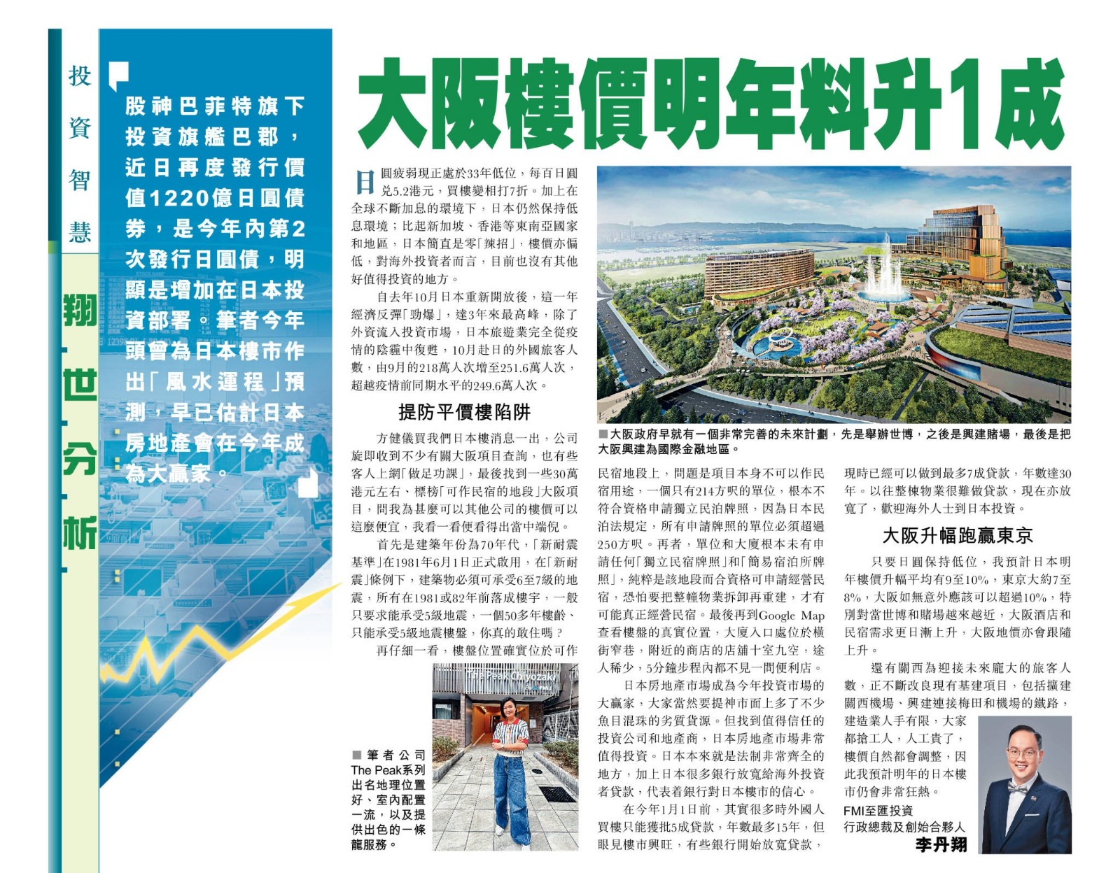 《星島日報投資王周刊》專欄「翔世分析」 —明年大阪樓價升幅或達10%