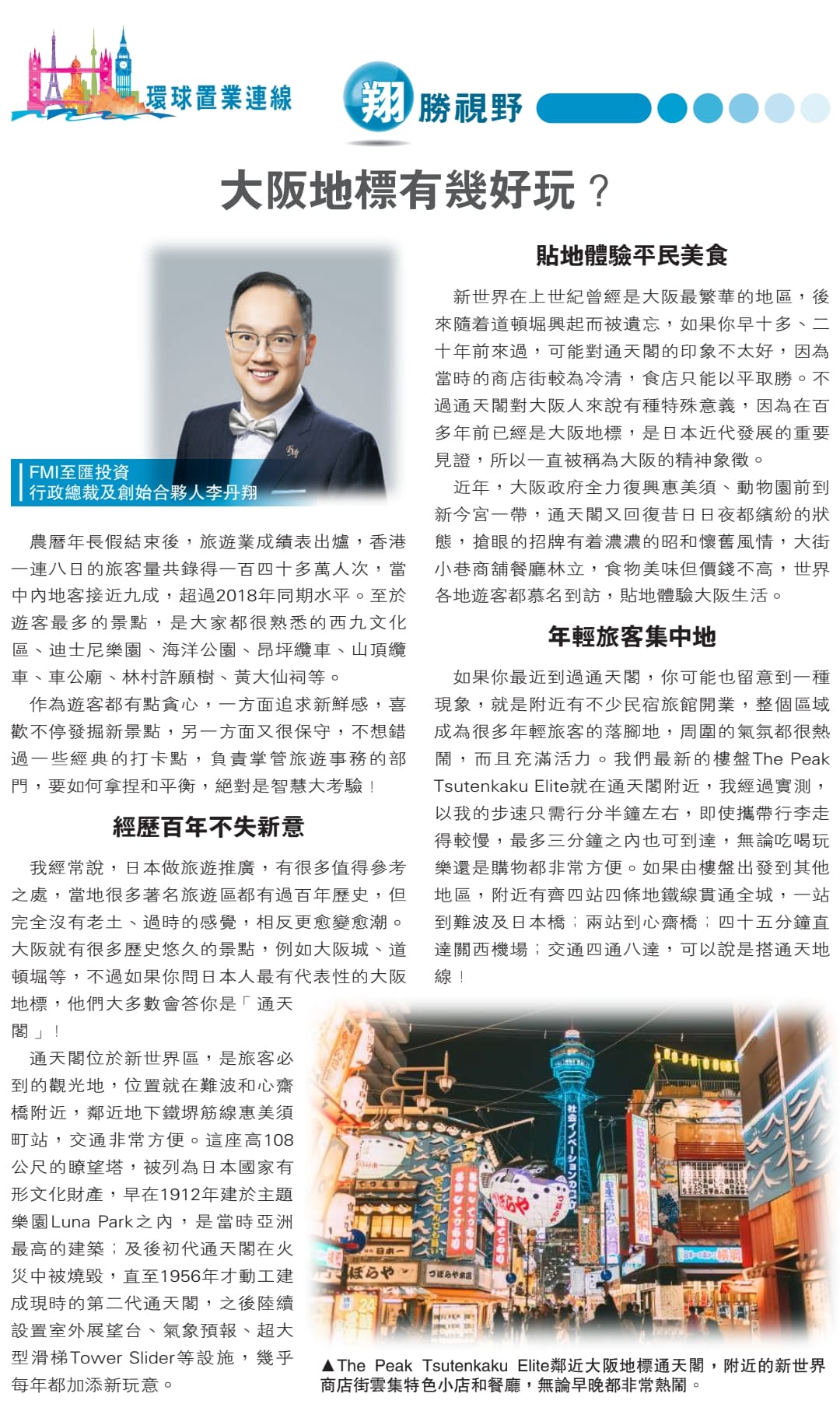 我經常說,日本做旅遊推廣,有很多值得參考之處,當地很多著名旅遊區都有過百年歷史,但完全沒有老土、過時的感覺,相反更愈變愈潮。大阪就有很多歷史悠久的景點,例如大阪城、道頓堀等,不過如果你問日本人最有代表性的大阪地標,他們大多數會答你是「通天閣」!