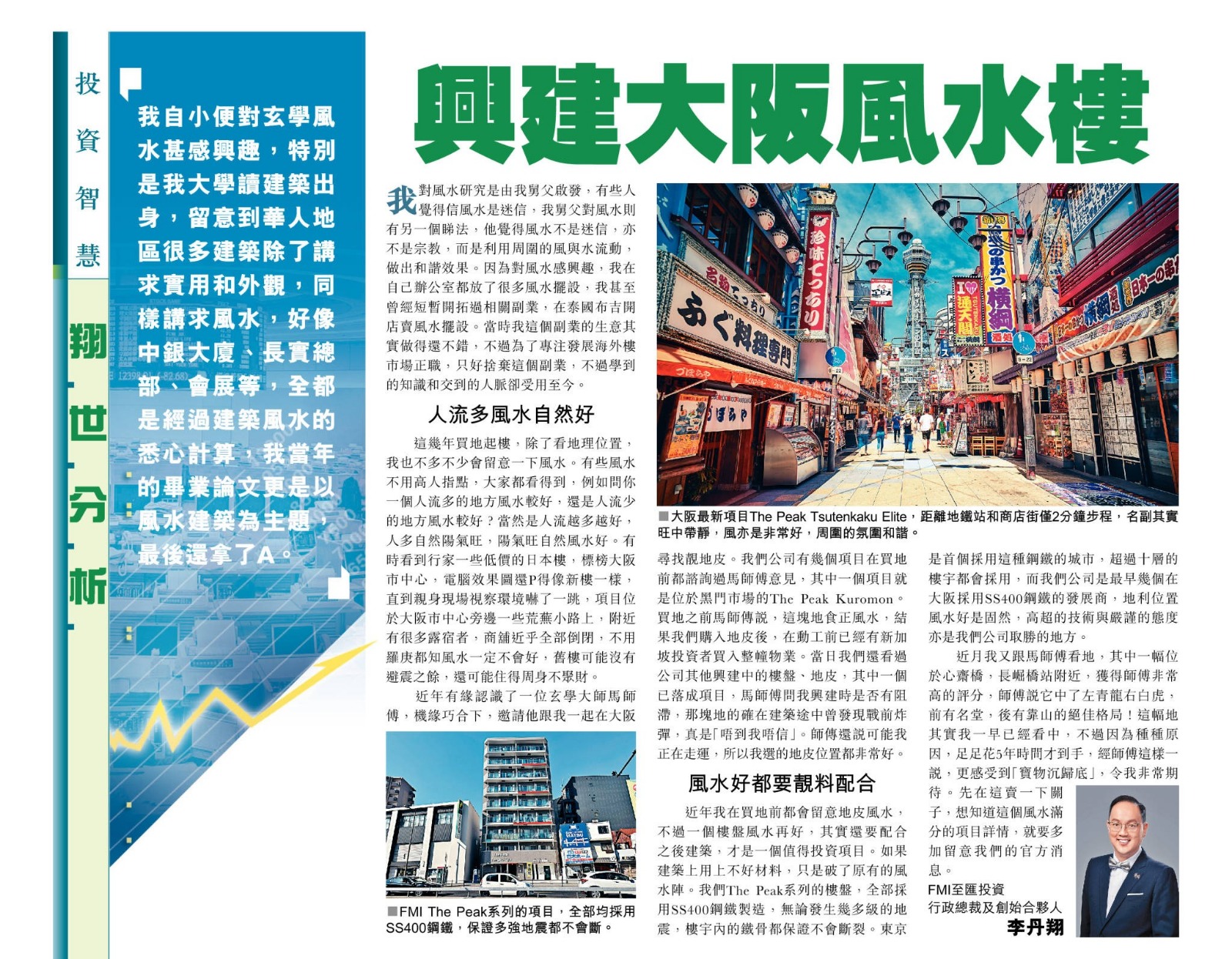 近年我在買地前都會留意地皮的風水,不過一個樓盤風水再好,其實還要配合之後的建築,才是一個值得投資的項目。如果建築上用上不好的材料,只是破了原有的風水陣。我們The Peak系列的樓盤,全部採用SS400鋼鐵製造,SS400是建築鋼鐵中的最高標準,SS400代表抗拉強度大於400MPa的一般鋼材,無論發生幾多級的地震,樓宇內的鐵骨都保證不會斷裂。東京是首個採用這種鋼鐵的城市,超過十層的樓宇都會採用,而我們公司是最早幾個在大阪採用SS400鋼鐵的發展商,地利位置風水好是固然,高超的技術與嚴謹的態度亦是我們公司取勝的地方。